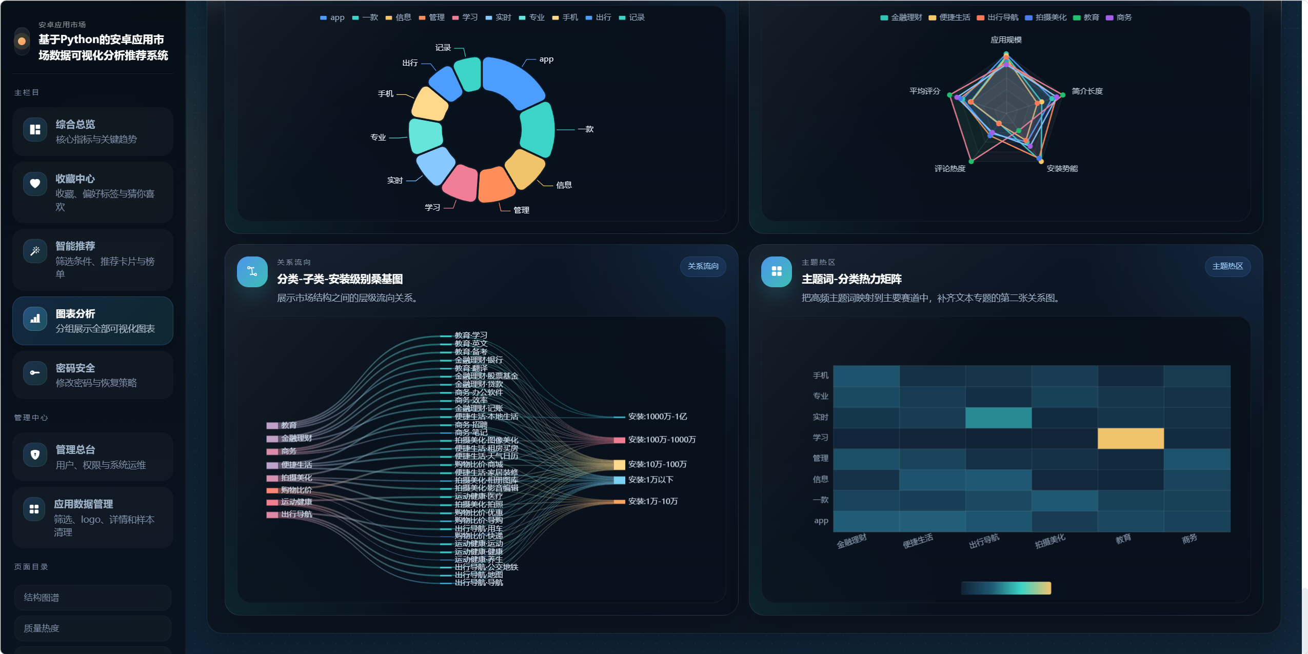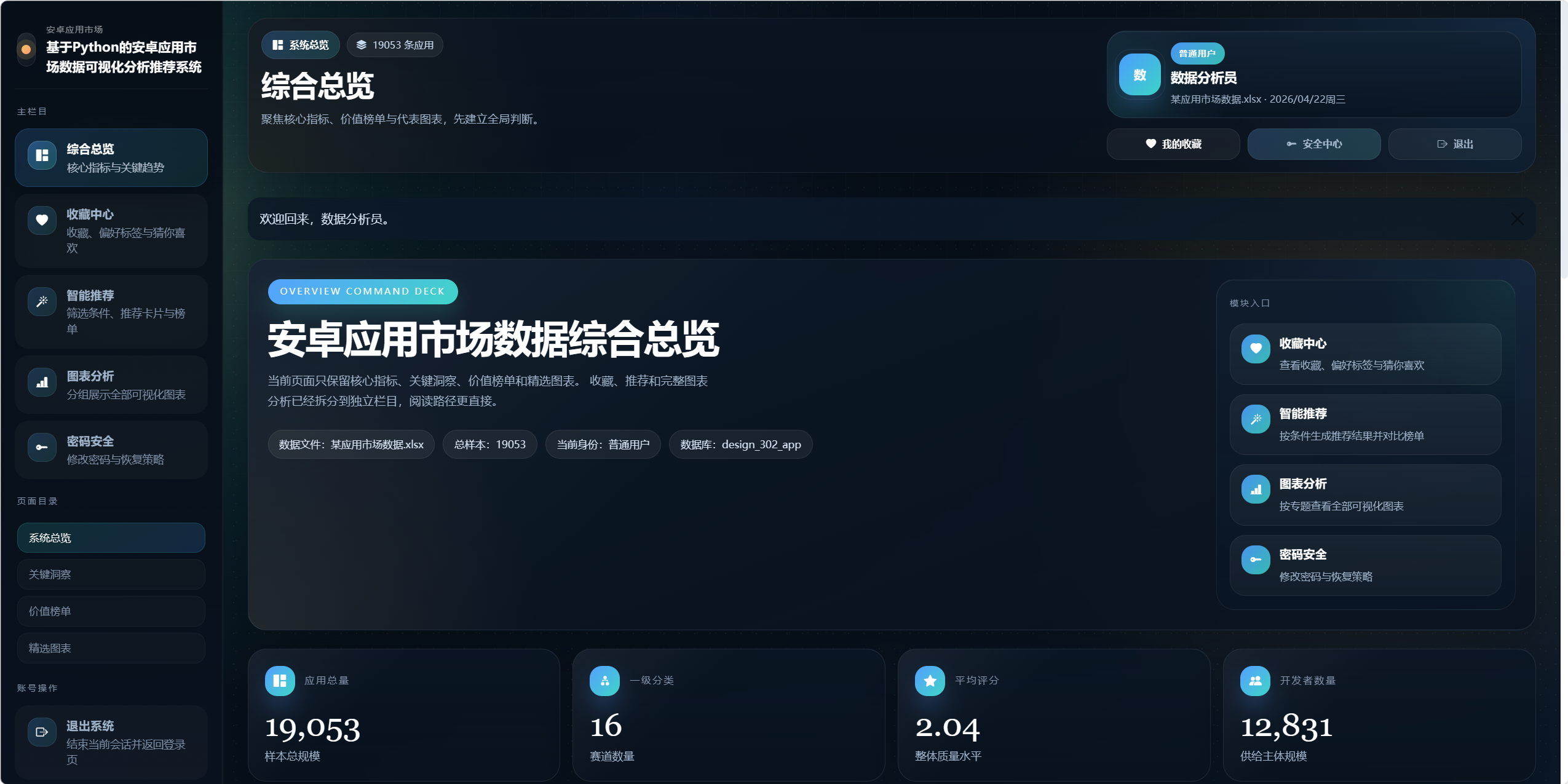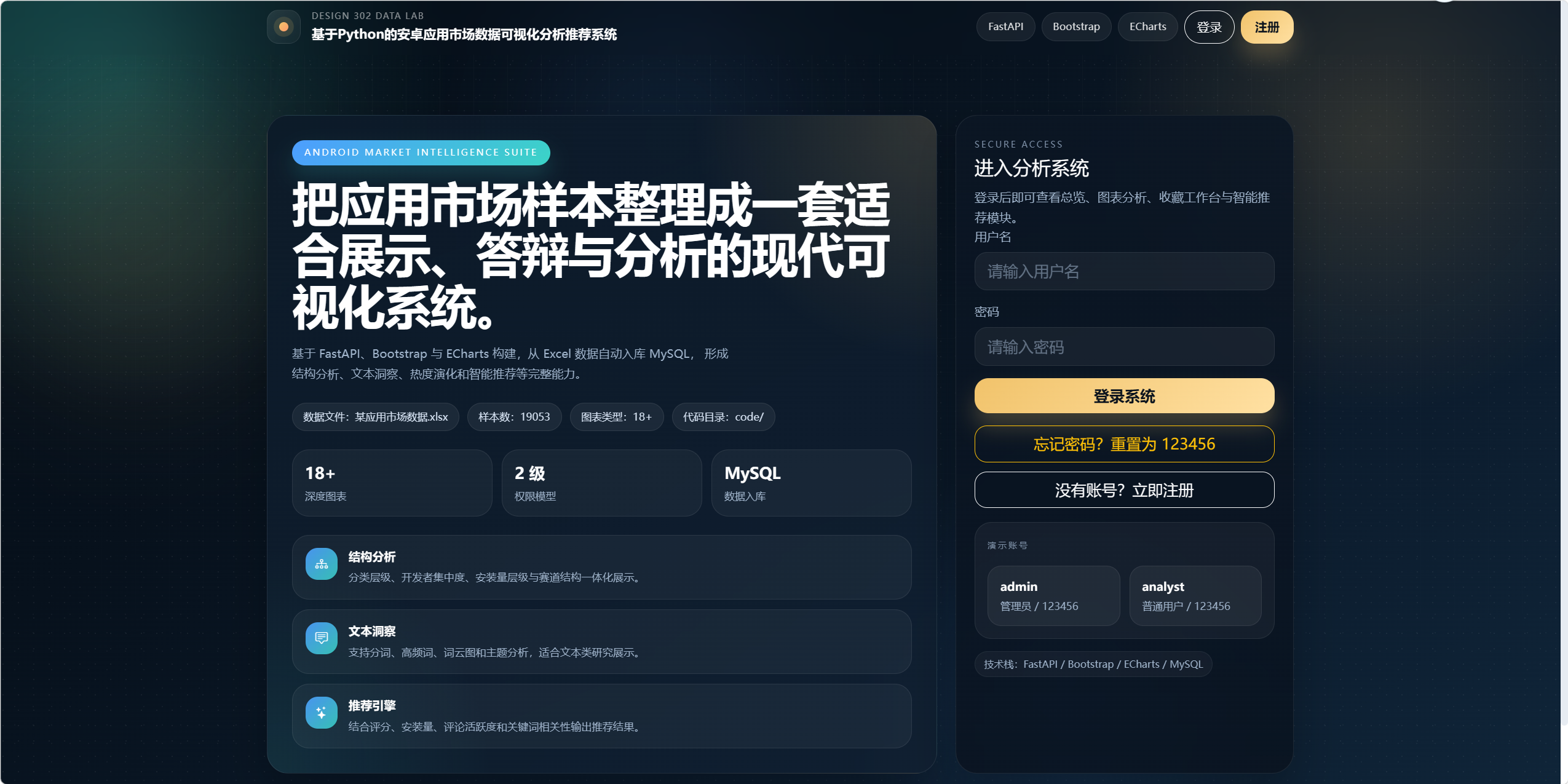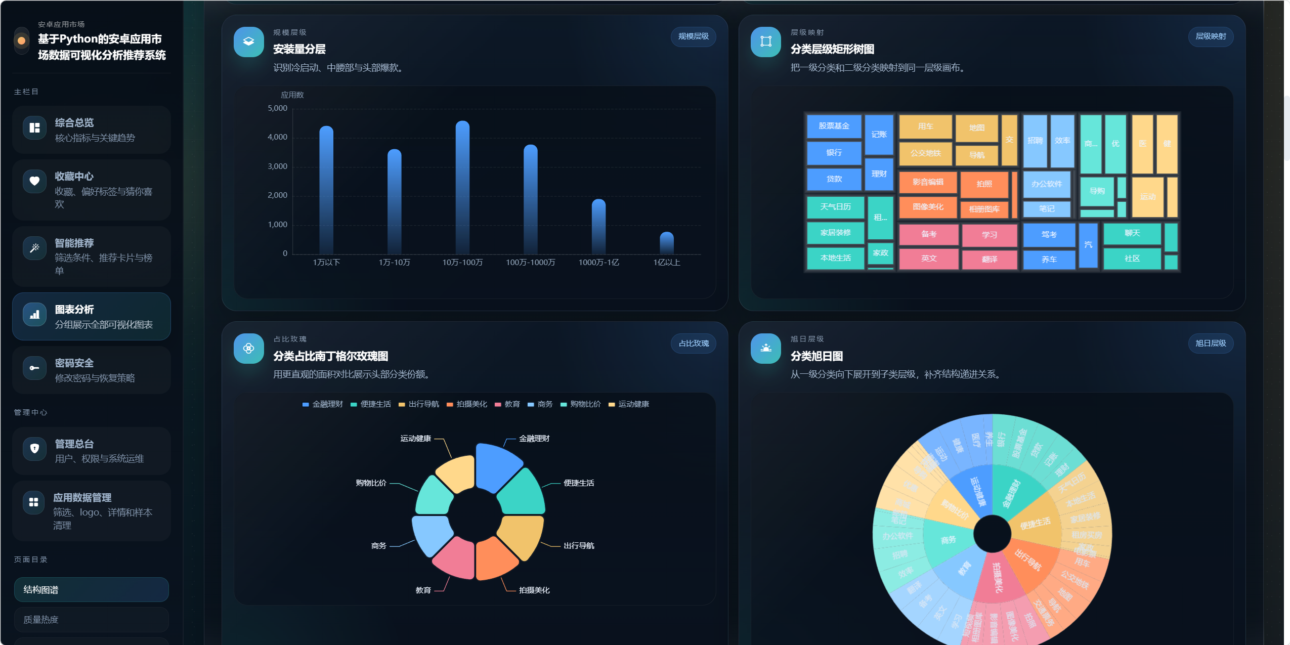 本系统以某安卓应用市场 Excel 数据集为基础,构建一个集"数据导入、数据管理、深度分析、可视化展示、智能推荐、权限控制"于一体的综合性应用市场分析平台。