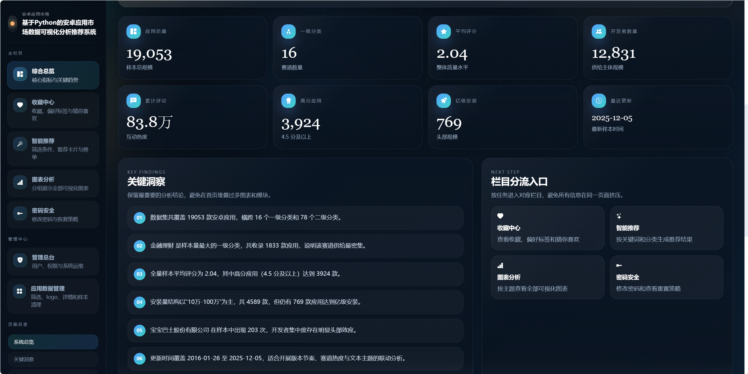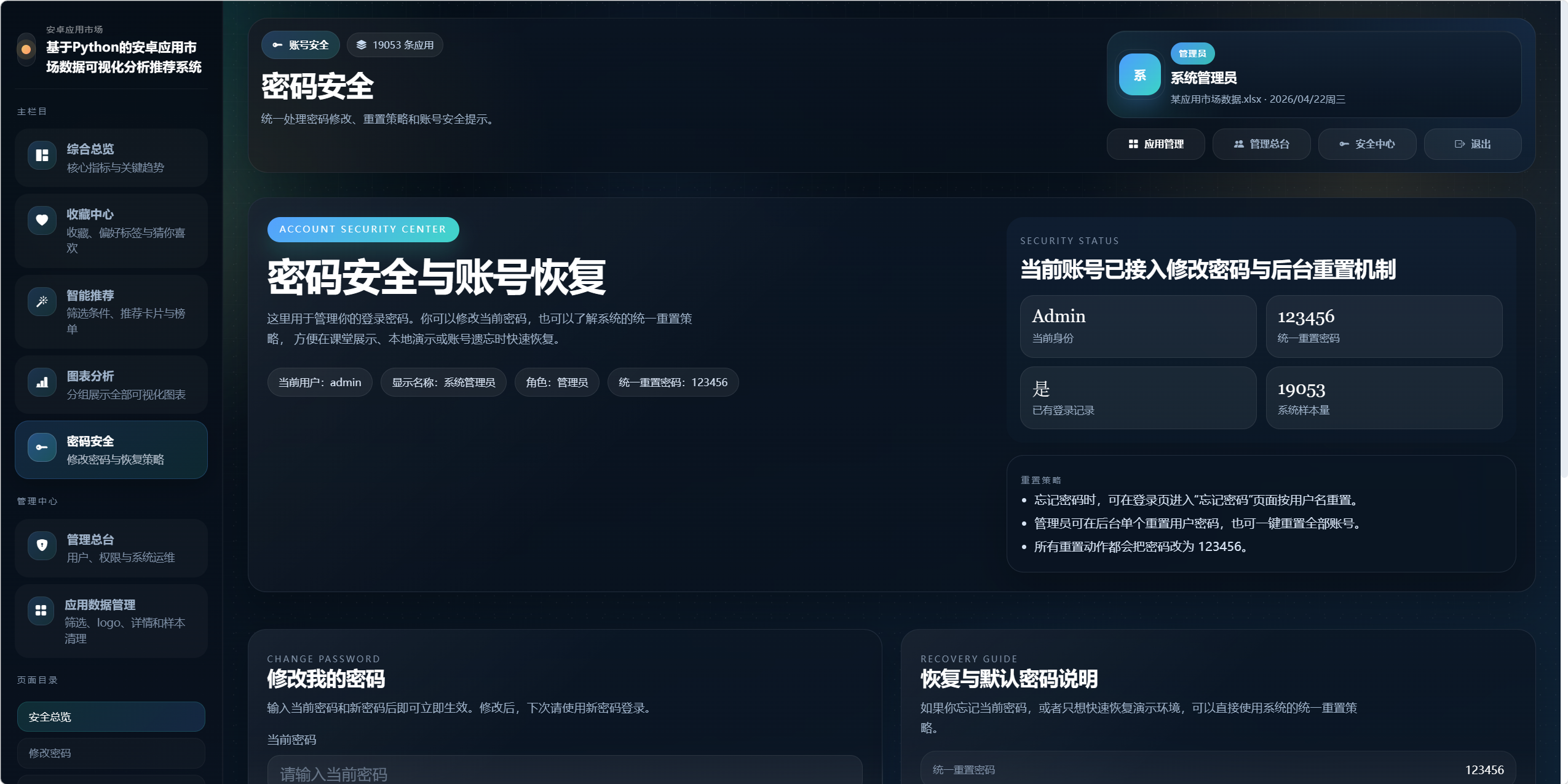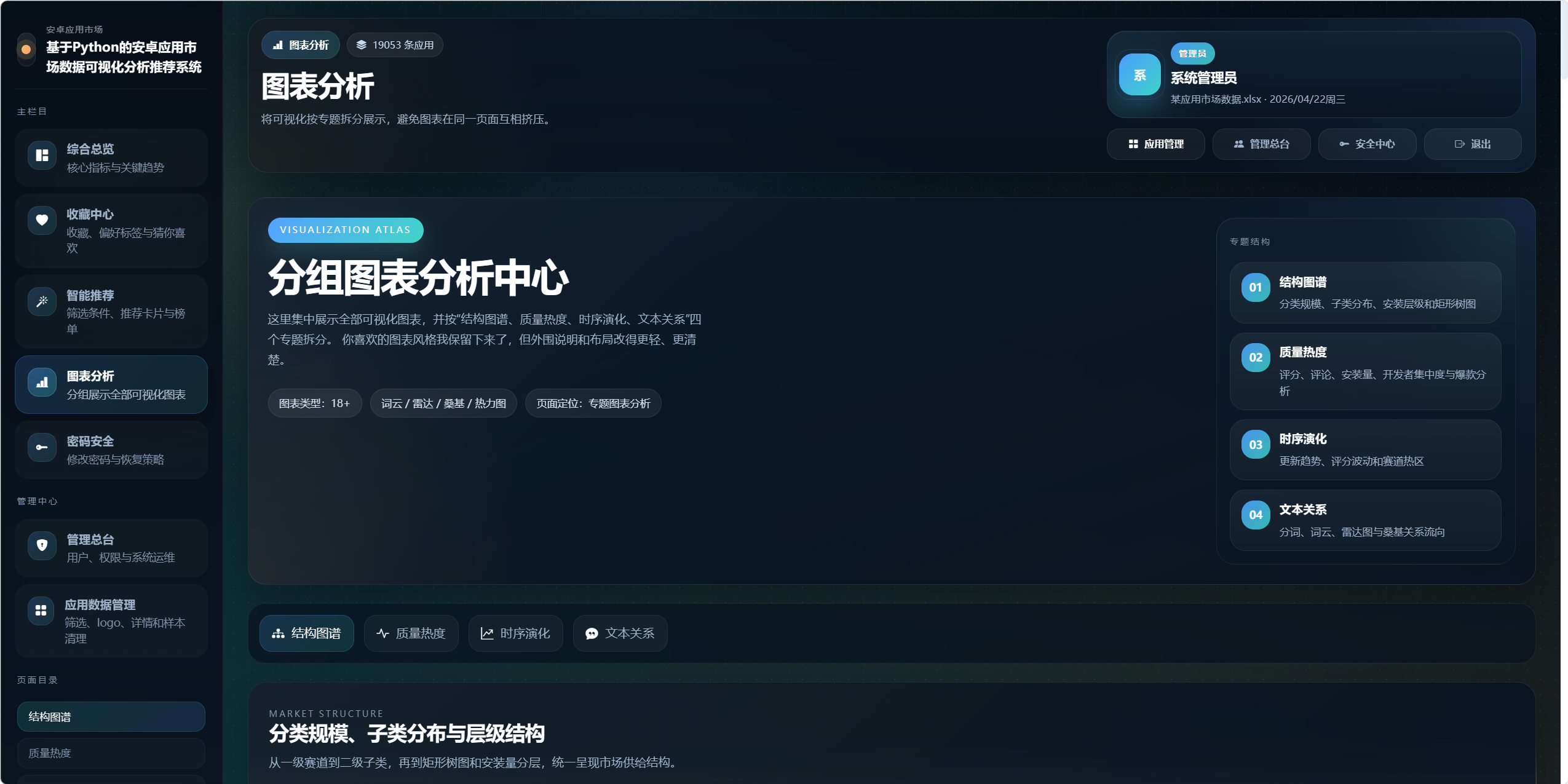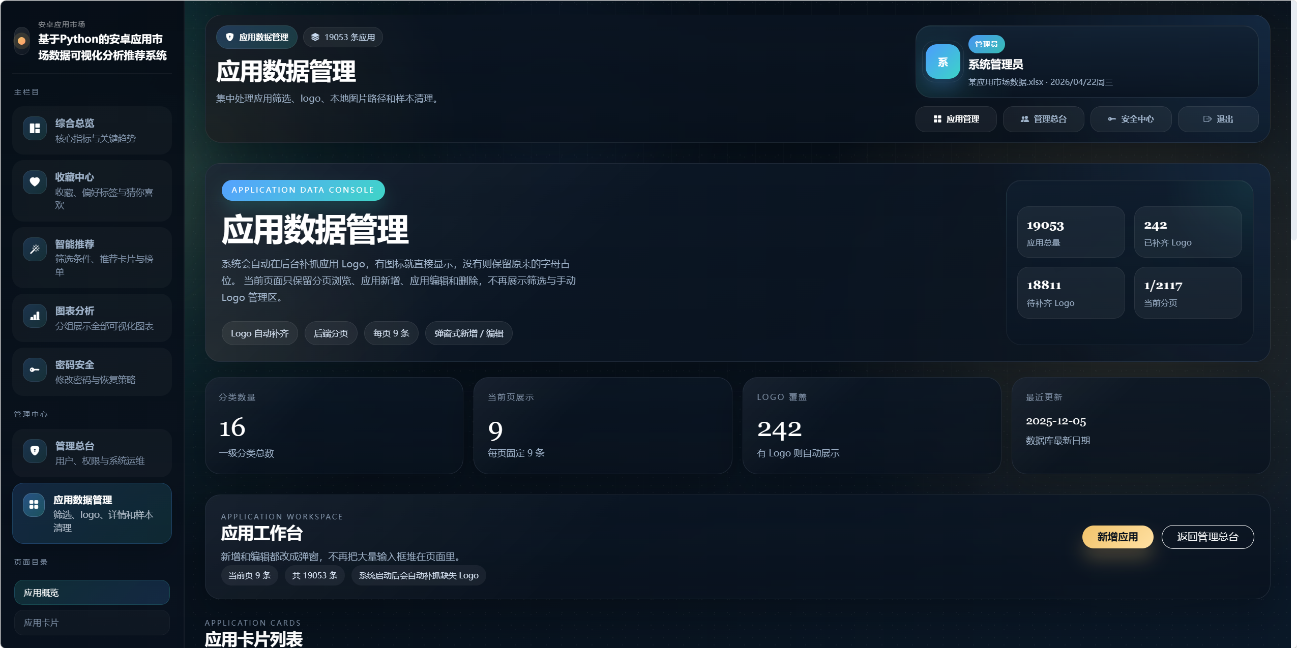 本系统以某安卓应用市场 Excel 数据集为基础,构建一个集"数据导入、数据管理、深度分析、可视化展示、智能推荐、权限控制"于一体的综合性应用市场分析平台。