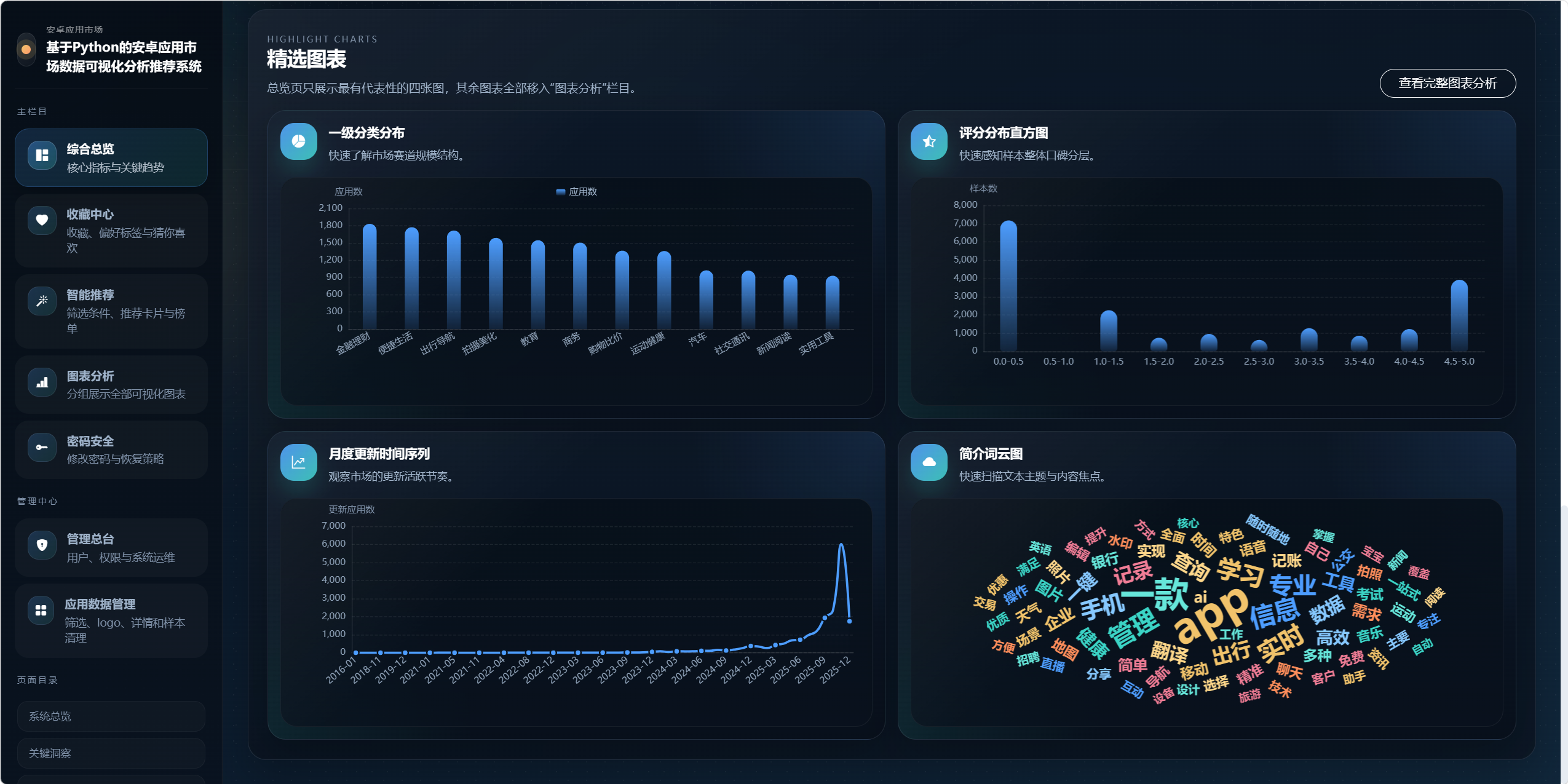 - 对应用市场数据进行多维建模,提炼分类规模、评分质量、热度结构、更新时间、文本主题等关键特征。