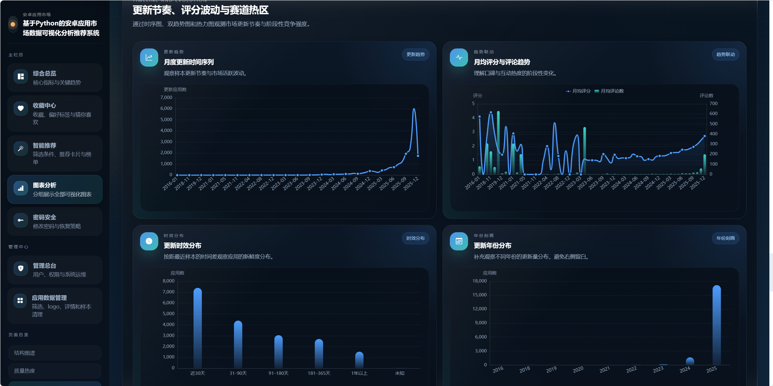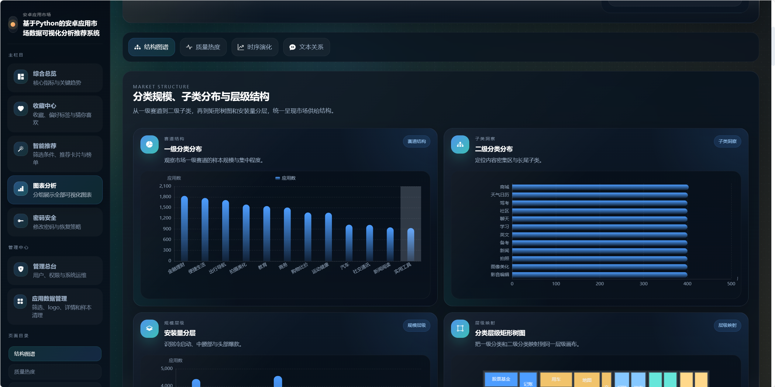 - 构建专题化图表分析页面,以结构图谱、质量热度、时序演化、文本关系四大主题组织图表。