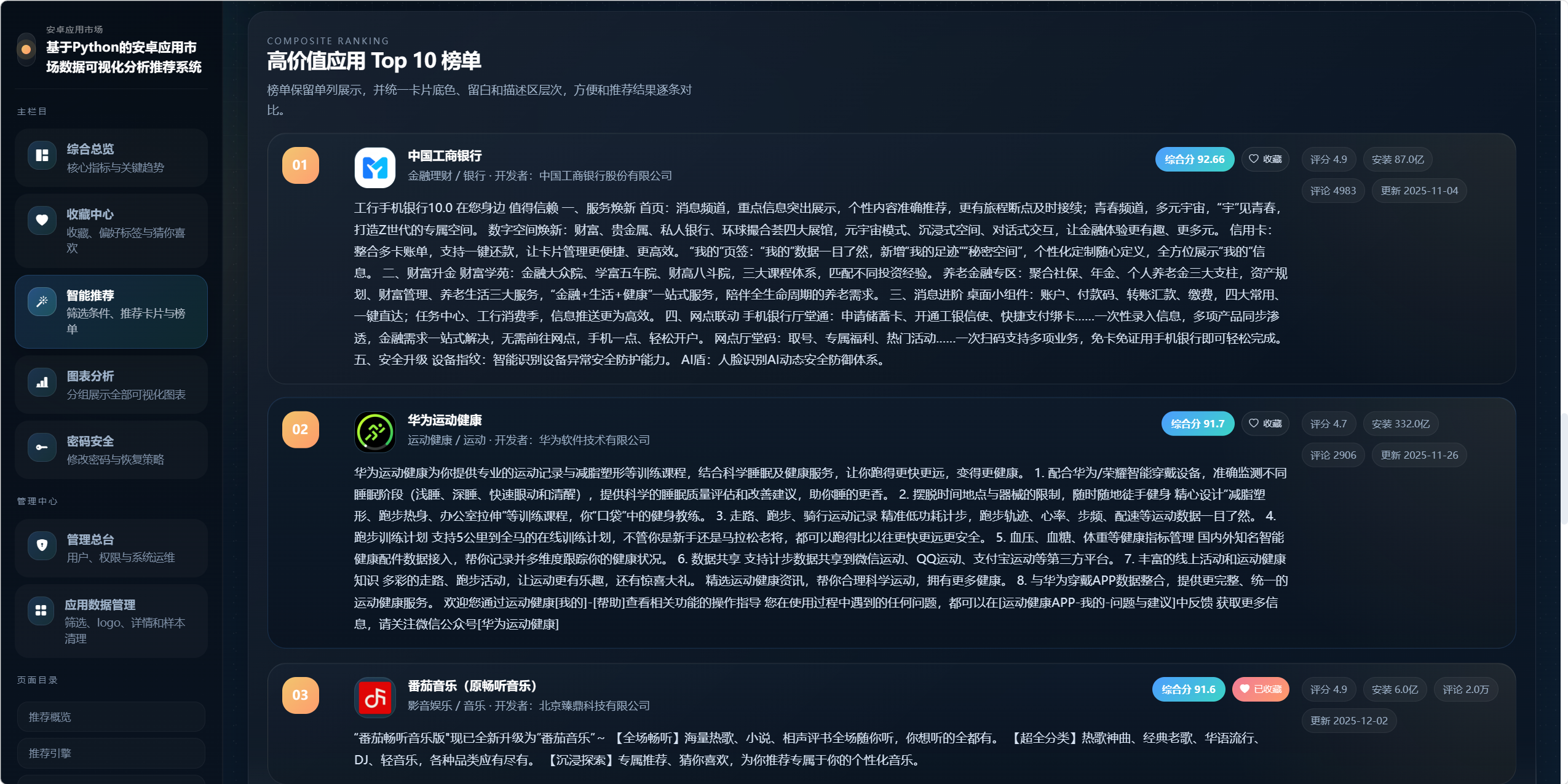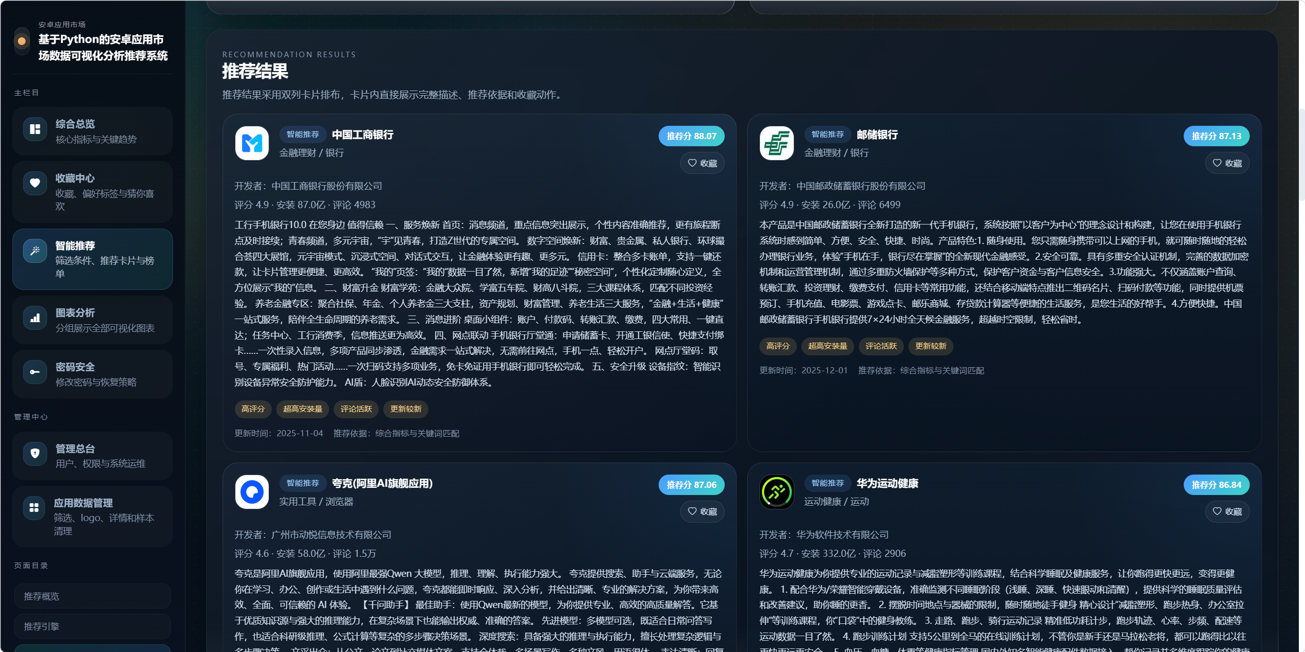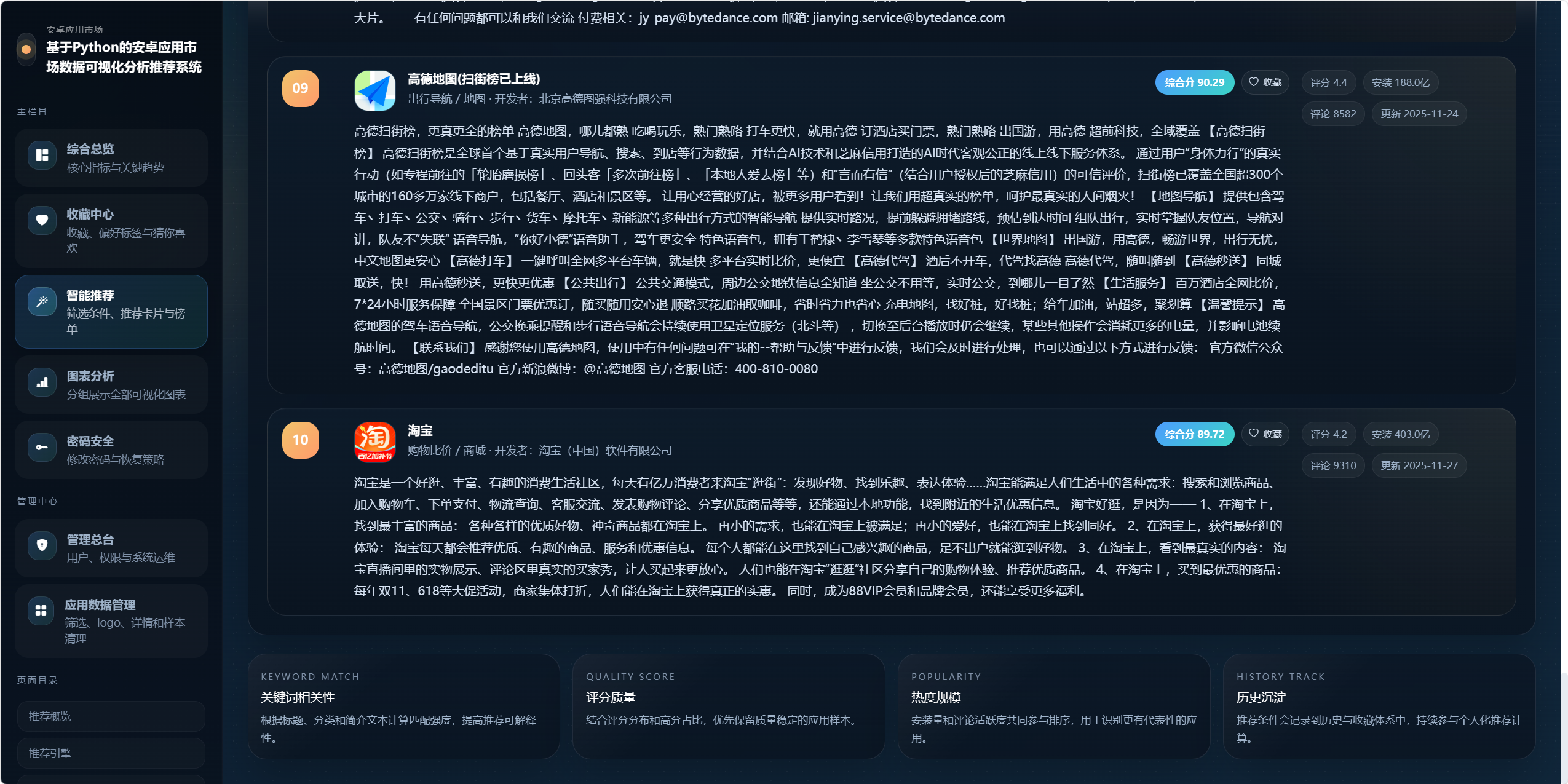 - 基于评分、安装量、评论量、关键词匹配、收藏偏好和历史行为生成推荐结果。