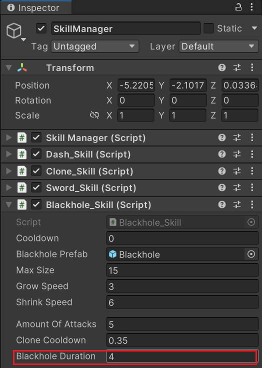 在PlayerBlackholeState中添加两个变量flyTime和skillUsed,来表示角色向上升起的持续时间和是否释放了黑洞技能。