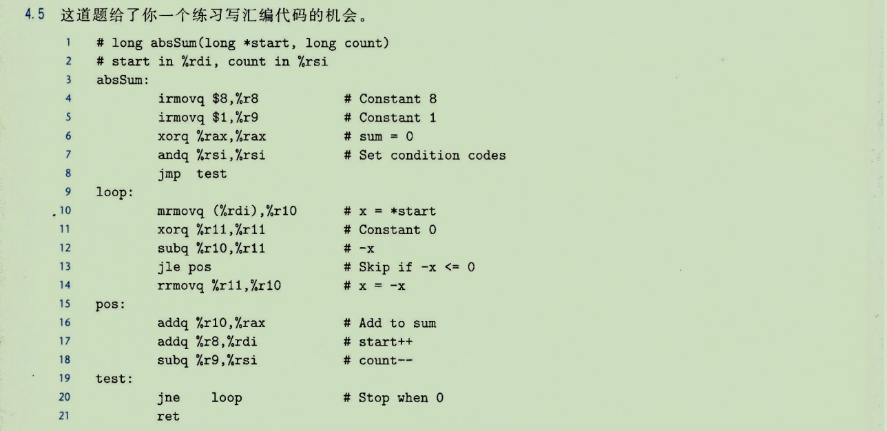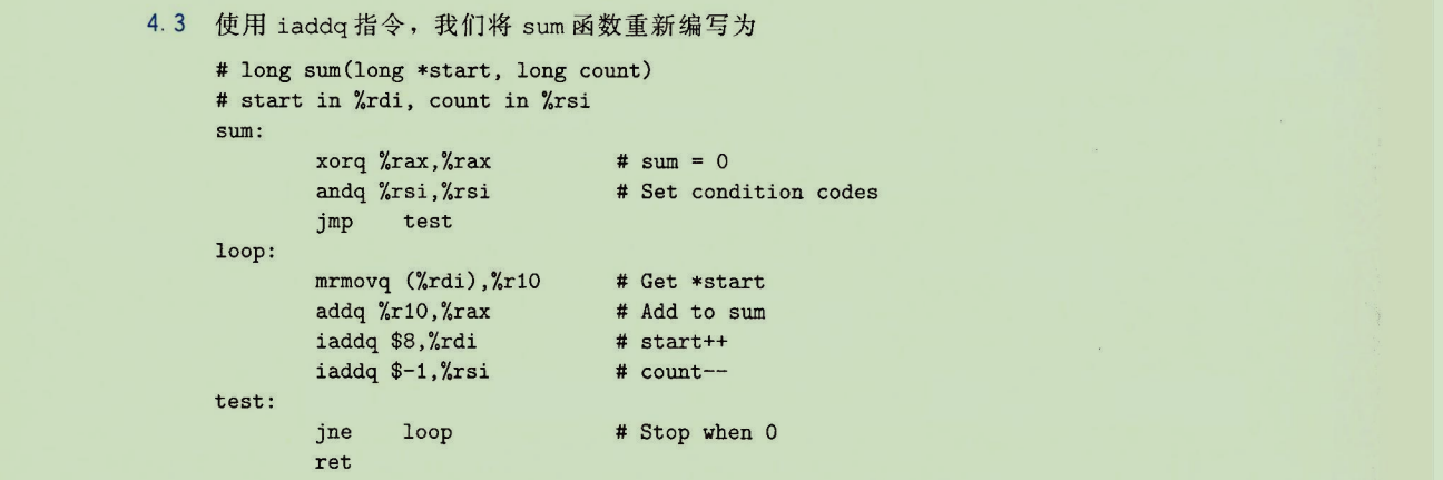 用iaddq重写sum:可消除对专用寄存器(%r8, %r9)保存常数的依赖,直接iaddq $1, %rsi等,使代码更紧凑。