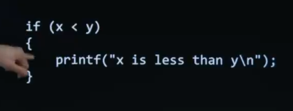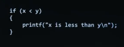 In C, the code is going to look like this. So it'll take a little bit of habit, a little bit of muscle memory to develop. But you're going to say " if ", then in parentheses, you're going to say " x less than y ", assuming x and y are variables. You're then going to use these curly braces.