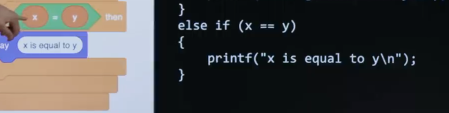 Yeah, the double equal signs does not match Scratch, but it's not in fact a bug or a mistake in C. Anyone have an intuition for why I did use two equal signs instead of one here ? Well, otherwise it would be mistaken for a variable, specifically assignment of a variable. So recall that in previous code, when we used the get_string function, we used an equals sign to assign, from right to left, the value of a variable. And that's a reasonable decision. " Equal " kind of means that the two should ultimately be equal even though you think about it from going right to left. Unfortunately, the authors of C kind of " painted " themselves into a corner. And presumably, decades ago when they realized, oh, sheet, we've already used a single equal sign, how do we represent equality of two values, the answer they came up with was, all right, we'll just use two instead. And thus was born this decision. Crazy enough, in other languages like JavaScript, you have not just one, but two, but also three equal signs in a row to solve yet another problem. So reasonable people will disagree as to how good or bad these decisions are. But in C, this is what you must do. But these's a bad decision here, too. It's still correct, the code, left and right. But I bet I could critique the quality of the design of both the Scratch code and the C code for reasons, what ?
