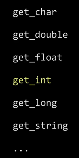 So rather than only focus on string, let's get a little more interesting with numbers here and see what we can do with something like integers, again, " int " for short, by taking a look at not get_string, as before, but now how about get_int. And for this, I'm going to give us a few other tools in our toolkit, those format codes to which I alluded earlier, like %s, fortunately are pretty straightforward.