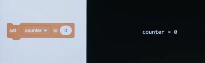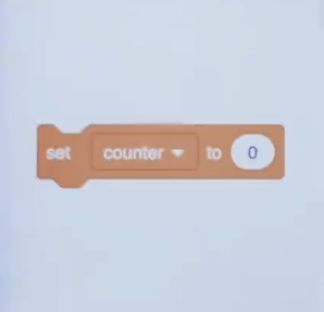 But what about with something like integers ? Well, you might not have used this in Scratch. But here's the organe puzzle pieces in Scratch via which you can create a variable called counter to count things. And you can set it equal to some value like 0. Now you can perhaps guess where we're going with this.