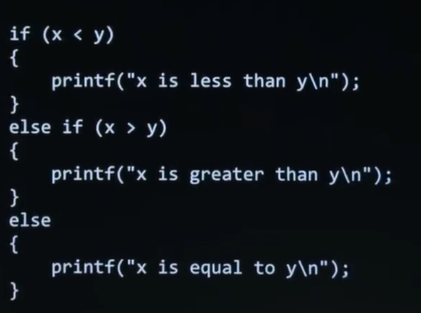 Do we have to ask this third question, " else if x equals y ? ". So short answer, no, logically, right ? Just based on arithmetic, either x is less than y or x is greater than y or what's the only other possible answer ? They must be equal, logically. So technically, you're just kind of wasting the computer's time by asking this question because it already knows, at that point, the answer. And you're wasting your time as the programmer bothering to type out more code or more puzzle pieces than you need because logically one stems from the other.