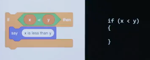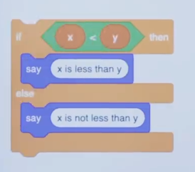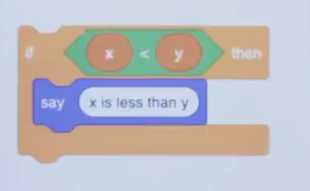 So here in Scratch is how we might Say if two variables, x and y, one is less than the other, then go ahead and Say, quote, unquote, " x is less than y ". So kind of a stupid program. But just to show you the basic syntax for Scratch, this is how you would ask the question, if x is less than y, then say this. So Say is the function, " if " is the conditional. And the green thing here we called, what ? A Boolean or a Boolean expression, which is just a fancy way of saying a question whose answer is true or false, yes or no, 1 or 0, however you want to think about it.