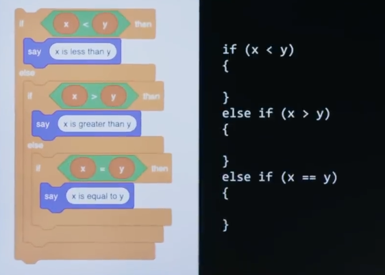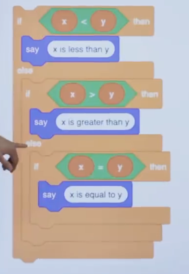 So it's following a pattern what about a three-way fork in the road, if x is less than y, then say x is less than y, else if x is greater than y, say x is greater than y, else if x equals y, than say x is equal to y.