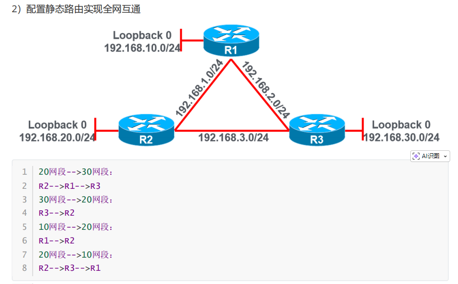 静态路由是手动指定下一跳 ,数据包只能走你写的路径,不会自动选路。要实现你图里的访问顺序,关键就是给目标网段指定对应的下一跳: