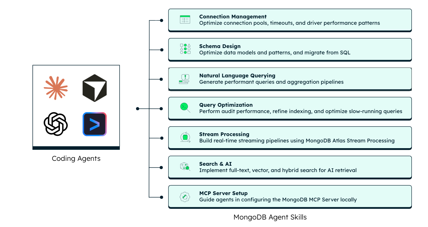 今天,我们将通过推出官方 MongoDB Agent Skills 来解决这个问题:结构化的说明、最佳实践和资源,代理可以发现并应用这些内容,从而在整个开发生命周期中生成更可靠的代码,从模式设计和性能优化到实现 AI 检索等高级功能。