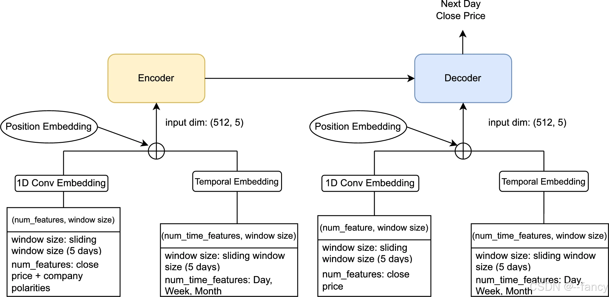 论文中仅使用了极性值这单一特征。文中的说法是将当天的极性分数求平均。即对于单一公司,其得到的特征维度为 1 × W 1 \times W 1×W,对于 N N N 个公司,则维度为 N × W N \times W N×W, W W W 为时间维度。在与传统时间序列特征合并之前,需要进行建模,该建模过程使用 Transformer,将其维度转换为 d m o d e l × W d_{model} \times W dmodel×W。最后使用向量直接相加的方式进行融合。
