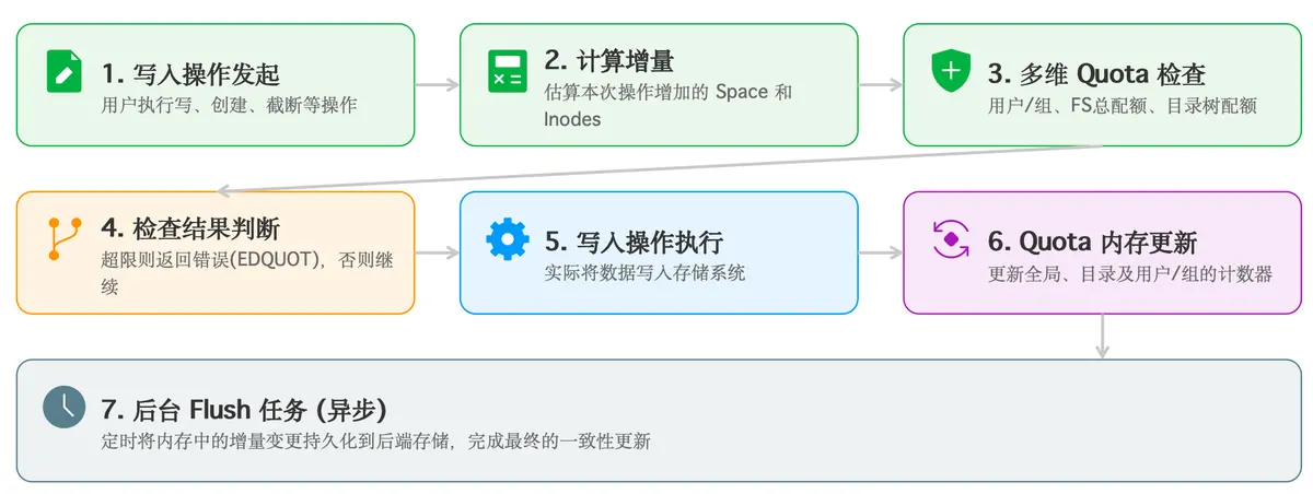 仅有同步模型和存储结构还不够,配额逻辑还必须嵌入具体的资源变更路径中。一次写入并不只是简单的数据追加,它可能同时伴随 inode 创建、块分配、目录项变化以及父级统计更新;在多客户端并发条件下,这些变化会共同作用于同一组配额约束。因此,只有把检查和统计更新真正放入写入、创建、截断、删除等操作路径,才能避免执行层面的超限写入和统计失真。