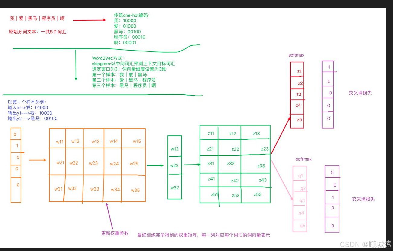 word2vec是一种无监督的训练方法,本质是训练一个模型,将模型的参数矩阵当作所有词汇的词向量表示