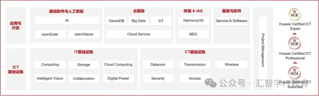 因应华为人才生态发展的重大发展趋势,赋能广大"开发者"基于华为的技术、产品与解决方案进行创新应用与开发,合并原"基础软硬件"和"云平台与云服务"两层为"应用与开发"层。
