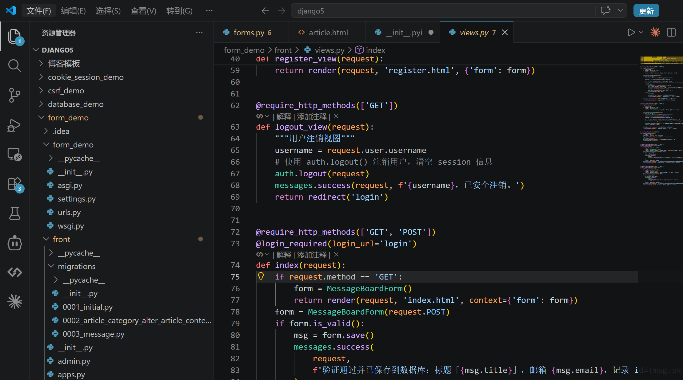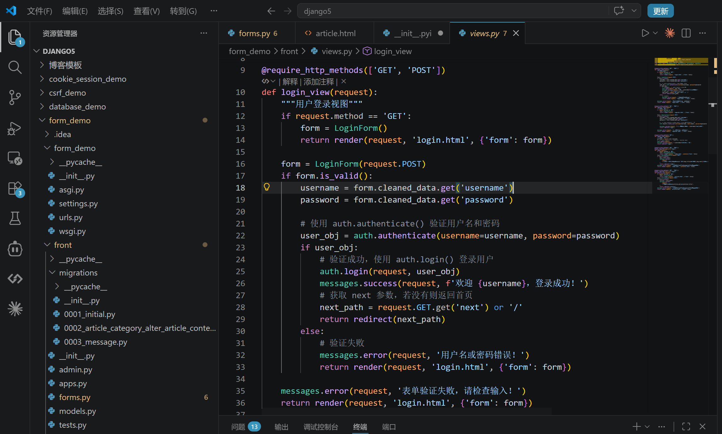 本文适配场景: Django 2.x/3.x/4.x 版本,基于实际项目(front 应用)演示,包含「表单校验+Auth 认证+前端模板+路由配置」全流程,解决新手常见的"密码明文存储""登录后回跳""未登录无法访问页面"等问题。