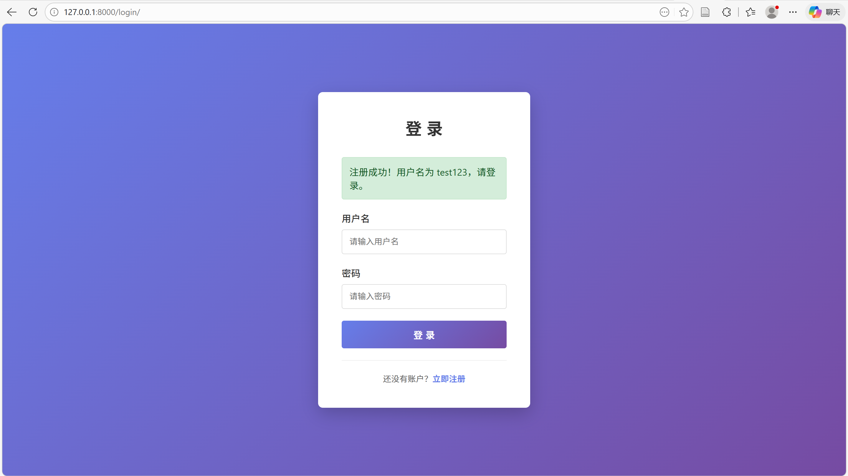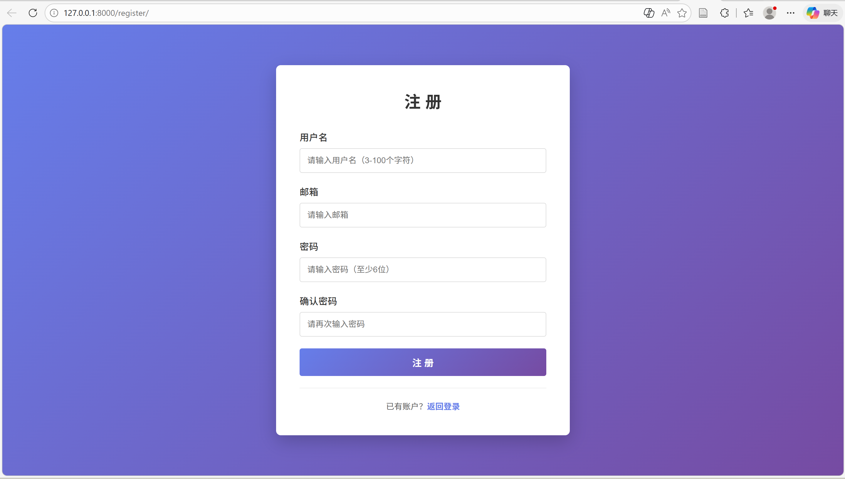 | 📝 注册 | http://127.0.0.1:8000/register/ ✅ |