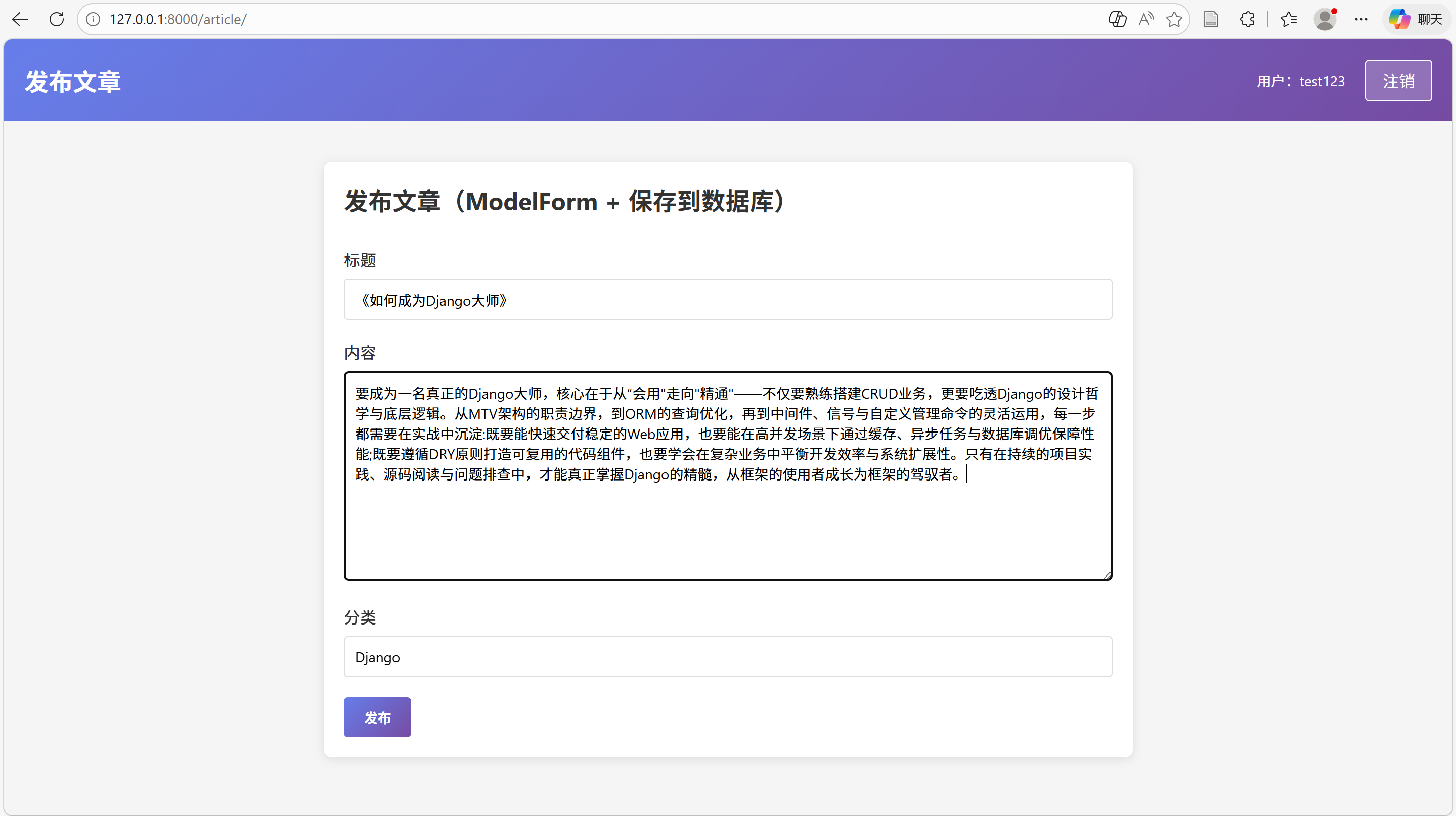 | 📄 发布文章 | http://127.0.0.1:8000/article/ ✅ |