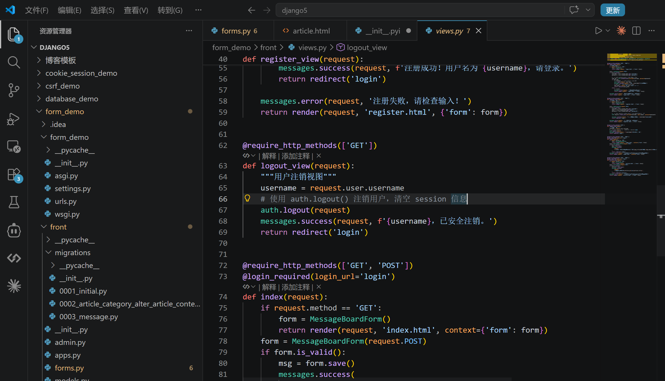 注销逻辑:清空 Session 信息,将 request.user 重置为匿名用户,无需复杂操作,一行代码搞定。