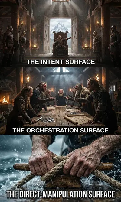 然而,GUI 不会消失,它会被降级。屏幕不再是工作开始的地方,而是成为工作被检查、协商和纠正的地方。随着软件从孤立的应用转向任务编排,成熟的基于意图的系统将 settles into 一个三层设计模型。