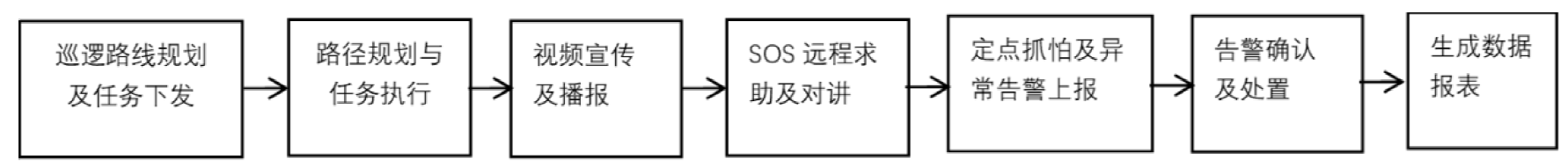 2)后台可配置统一的云端调度管理平台,用于任务管理、全流程实时监控、异常信息上送,监控中心可在线处置并通过多种呈现方式推送警情,及时协同保安人员到现场处置,达到事中闭环处置、事后溯源分析的目的。