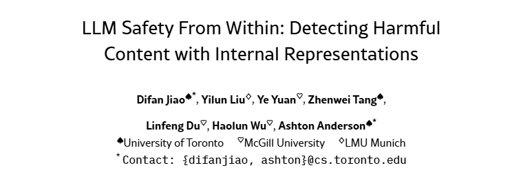 然而,这种对终端层的依赖忽视了编码在整个模型各层中的丰富安全相关特征。近期工作揭示,LLM 的内部表示编码了丰富的专门化特征,利用这些内部表示能在分类任务中带来显著的性能提升(Gurnee et al., 2023; Jiao et al., 2024; Lai et al., 2025)。此外,多项研究表明,LLM 的内部表示编码了用于内容安全的细粒度概念(Zhao et al., 2024, 2025b; Kadali and Papalexakis, 2025)。但这些发现尚未被系统地转化为实用的安全防护模型。这一差距提出了一个问题:我们能否利用 LLM 的内部表示来构建更好的内容有害性检测器?