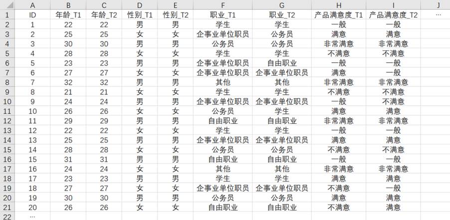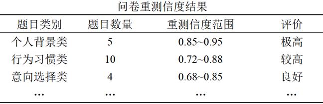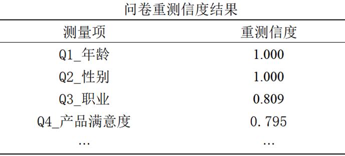 1\] 史静琤, 莫显昆, \& MO Xiankun. (2012). 量表编制中内容效度指数的应用. 中南大学学报:医学版, 37(2), 4. \[2\] 柯友枝, 孙建刚, 李博, 刘阳. 问卷是否有效------基于2010-2020年CSSCI收录体育期刊文献的系统分析\[J\]. 上海体育学院学报, 2023, 47 (02): 37-47+103. ### 3、SPSSAU内容效度软件操作 在SPSSAU【问卷研究】模块,选择【内容效度】,按提示将专家对每个问题的评分(只能是1/2/3/4分,分值越高越有效)粘贴或修改后,点击"开始分析"按钮,操作如下图: ### 4、内容效度分析结果解读 SPSSAU输出内容效度分析结果如下: **(1)测量项内容效度专家评分及指标计算**  分析上表可知: * **CVI** **:**所有3个测量项的I-CVI值均为1.000,大于6位专家时的临界值(通常为0.78),说明每个测量项的内容效度均达标。 * **调整Kappa K\*** **值:**所有3个测量项的K值均为1.000,大于0.74的"优秀"标准,说明校正后的内容效度非常优秀。 本次内容效度分析结果非常理想,问卷内容能有效反映所测特质。 【建议】通常情况下建议使用校正内容效度即针对调整Kappa K\*值进行判断,因为K\*值将专家打分独立性纳入考虑范围。 **(2** **)整体内容效度**  上表格展示整体内容效度的两个指标------全体一致S-CVI和平均S-CVI指标。分析上表可知,全体一致S-CVI = 15/15=1≥0.8,通过。平均S-CVI指标,其为I-CVI指标的算术平均为1\>=0.9,其通过。 【建议】全体一致S-CVI指标衡量的是所有测量项整体内容效度情况,而平均S-CVI指标衡量的是平均内容效度,一般查阅全体一致S-CVI可能更加适合。 **(3** **)不同专家人数各情况下I-CVI** **评估速查表**  上表格为不同专家人数及打分为3/4分时专家个数不同情况时的评估速查表。I-CIV指标和调整Kappa这两个指标均可对内容效度进行评价,但二者评价结果可能出现不一致,原因在于二者计算公式和评价标准不一致。 以上即为非量表问卷有效性检验方法------内容效度分析的全部内容,该方法通过专家打分对问卷的有效性和合理性进行检验,内容效度指标的计算简单也比较通俗易懂。 ## 三、非量表问卷重测信度分析 如果说内容效度是"检验题目设计是否合理",那重测信度就是"检验测量结果是否稳定"。 ### 1、重测信度 重测信度是指用同一研究工具两次测定同一研究对象,所得结果的一致程度。一致程度越高,说明研究工具的稳定性越高,重测信度也就越高。 对于测量事实或类别的**非量表问卷,重测信度是最适合的信度评估方法**。它通过对比同一批人在两个时间点(通常间隔2周)的回答是否一致,来判断问卷的可靠性。 比如你调研"大学生外卖购买行为",让100名大学生今天填一次问卷,2周后再让这100名大学生填一次相同的问卷,如果两次填写的结果高度一致,说明重测信度高,数据稳定可靠;如果两次结果差异很大,说明问卷测量不稳定,数据不可信。 ### 2、收集重测数据 (1)选取同一批被试:重测的被试必须和第一次测量的被试完全一致,不能更换被试。在数据收集时,需要通过某种标识(如手机号后四位、学号等)进行匹配; (2)两次测量的问卷完全一致:题目、选项、表述都不能修改,确保测量工具相同; (3)两次测量的时间间隔:需要把握尺度,多数研究者推荐2周左右较为合适; (4)控制无关变量:两次测量的场景、时间、环境尽量一致(比如都是线上填写,都是晚上8点左右),避免无关因素影响被试的回答。 ### 3、按题目类型选择分析方法 重测信度的分析需要根据不同的题目类型选择相应的统计方法。需要注意的是,重测信度不适用开放题和未处理的多选题。 **(1** **)数值型填空题**(如年龄、收入、消费金额)推荐使用皮尔逊相关系数。 将同一批受访者两次测量的数值进行相关分析,相关系数越高,说明数值越稳定。一般认为相关系数大于0.7表示重测信度良好。 **(2** **)二分类定类题**(如男/女,是/否)推荐使用Kappa系数。 Kappa系数专门用于评价分类变量结果的一致性。一般认为κ≤0.4表示一致性较差;0.4<κ≤0.6表示中度一致;0.6<κ≤0.8表示有较高的一致性;κ>0.8表示有极好的一致性。 **(3** **)多分类定类题**(如职业、品牌偏好、教育程度)这类题目需要根据选项的性质区分处理: * 无序多分类(选项无顺序关系,如职业:学生/公务员/企业员工/自由职业):推荐使用简单Kappa系数,关注两次回答是否完全相同。 * 有序多分类(选项有等级顺序,如满意度:非常不满意/不满意/满意/非常满意):推荐使用线性加权Kappa系数。加权Kappa认可"近似"回答的合理性,例如第一次选"不满意"、第二次选"非常不满意"的偏差,应比从"不满意"跳到"非常满意"的偏差更小,给予较轻的惩罚。 ### 4、SPSSAU重测信度软件操作 **(1** **)数据格式整理** 重测信度的数据格式,核心是同一被试,两次测量结果在同一行。在Excel中,你需要将两次测量作为不同的问题(列)横向排列,数据格式示例如下图: * 行一一对应: 第一行必须是用户1的两次回答,第二行必须是用户2的两次回答。 * 样本量一致: 两次测量的人数必须完全相等。如果第二次有人没填,那一整行(包括第一次的数据)通常都需要剔除。 * 变量命名: 建议加上前缀(如T1代表Time1,T2代表Time2),方便在SPSSAU拖拽变量时快速区分。 **(2** **)SPSSAU** **软件操作** 将数据整理好后,上传至SPSSAU平台。按题目类型选择分析方法:例如针对连续变量"年龄",使用【通用方法】模块【相关系数】进行重测信度分析,操作如下图:SPSSAU输出