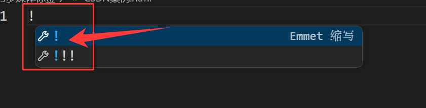 对于迅速生成代码框架,我们输入'!'以后按下Tab或者回车↩︎即可,方便我们快速搭建框架: