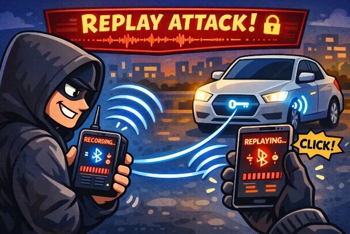 重放攻击是指攻击者截获并记录钥匙发出的合法信号后,在稍后时间重放该信号以解锁车辆。这一攻击之所以可行,根源在于部分厂商仍在使用过时的固定学习代码技术,而非滚动代码技术。