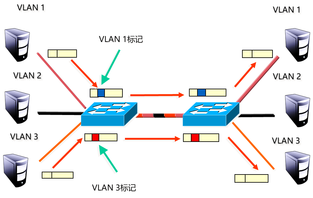 左侧VLAN1主机访问右侧VLAN1主机时,先经过左侧交换机,进入时交换机给数据帧打上标签。
