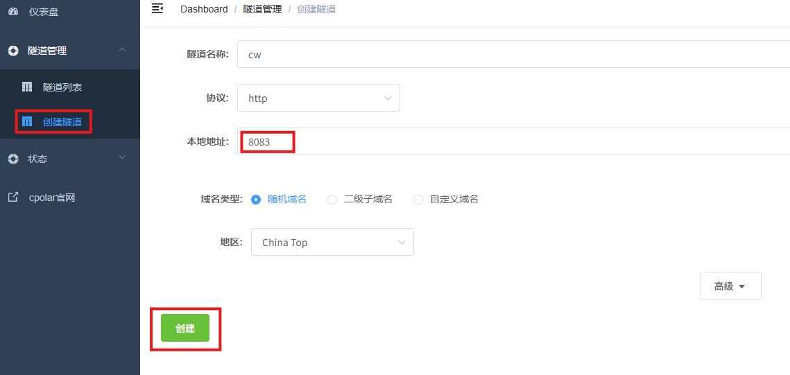 登录cpolar web UI管理界面后,点击左侧仪表盘的隧道管理------创建隧道: