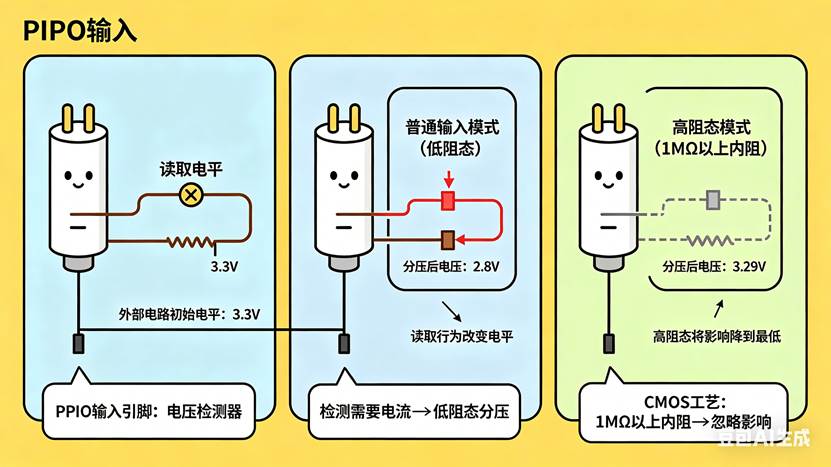 那个"偷电流"的输入(对应教程3.11节), GPIO输入引脚,本质上是一个电压检测器 。它检测引脚上的电压是高还是低。但检测本身需要电流------电流会从外部电路流入引脚,或者从引脚流出到外部电路。如果输入阻抗不够高,这个电流就会分压 ,改变外部电路的电压。你测到的电压,已经不是原来的电压了。你影响了它,然后以为测到了真实值。