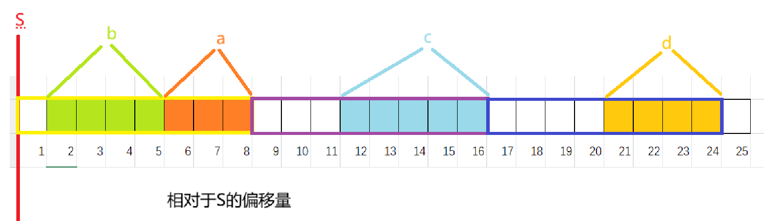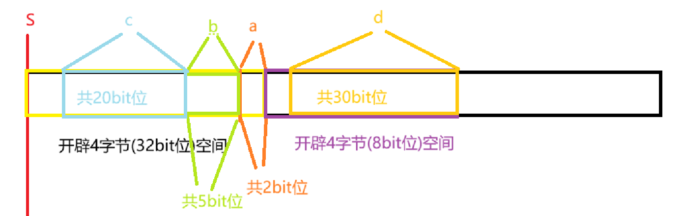 最后给 d 分配空间由于第二次开辟的空间不足以分配d的4bit位,所以再次开辟,舍弃剩余3bit位。如下: