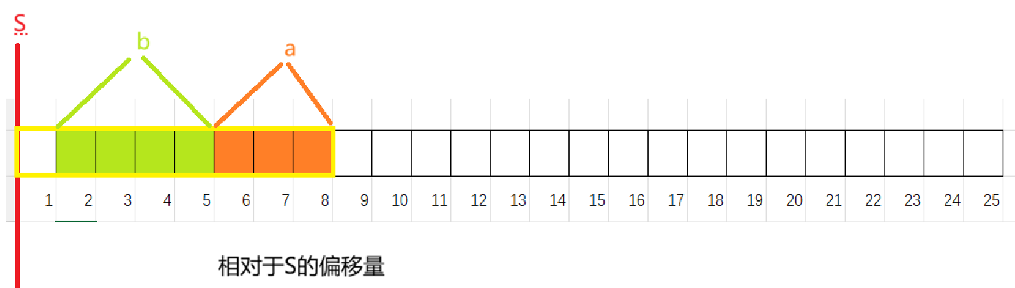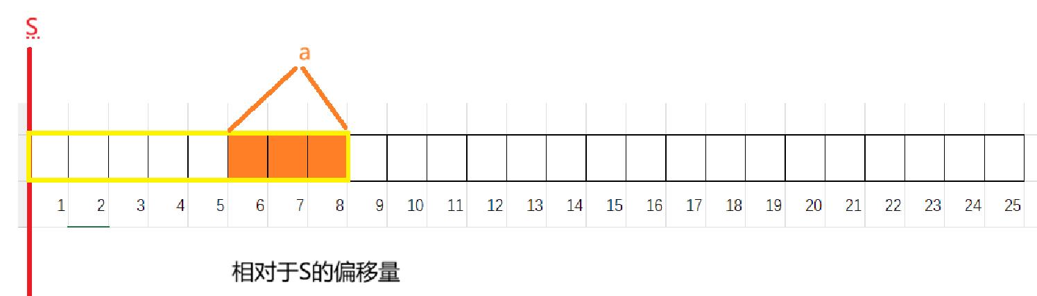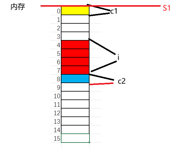 此时要分配第一个成员变量 a 的空间,但现在没有空间,所以要开辟一块,由于 a 是char 类型,所以开辟8 bit 位空间。假设黄色是我们第一次开辟的空间: