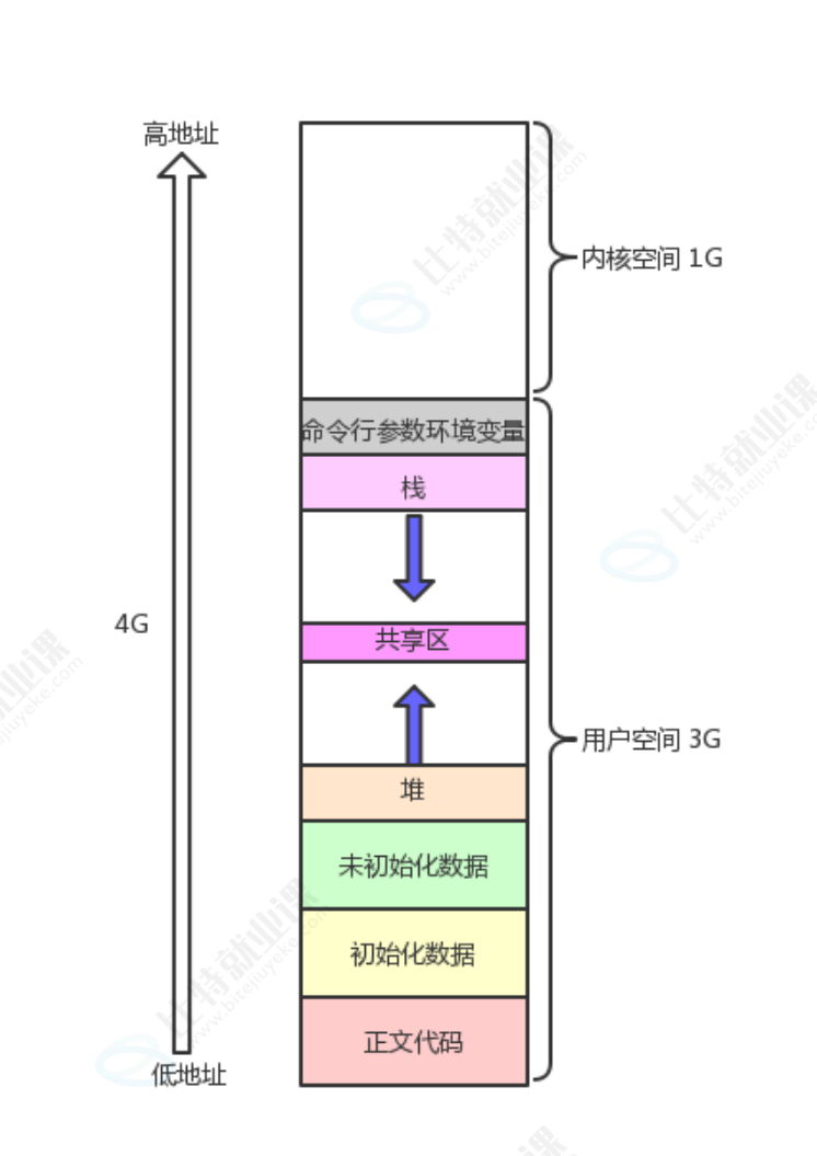 0~3GB的空间为用户空间,3~4GB的空间为内核空间。用户空间是用户拿着地址就能直接访问的,内核空间不行。