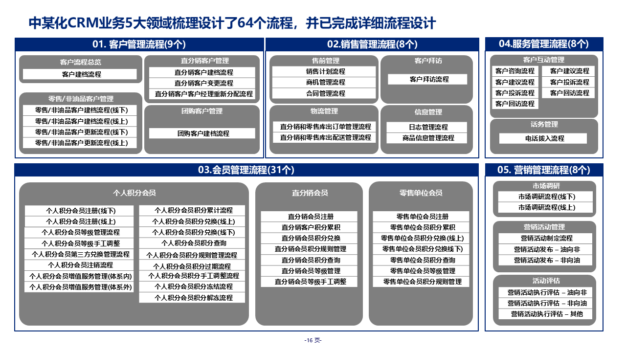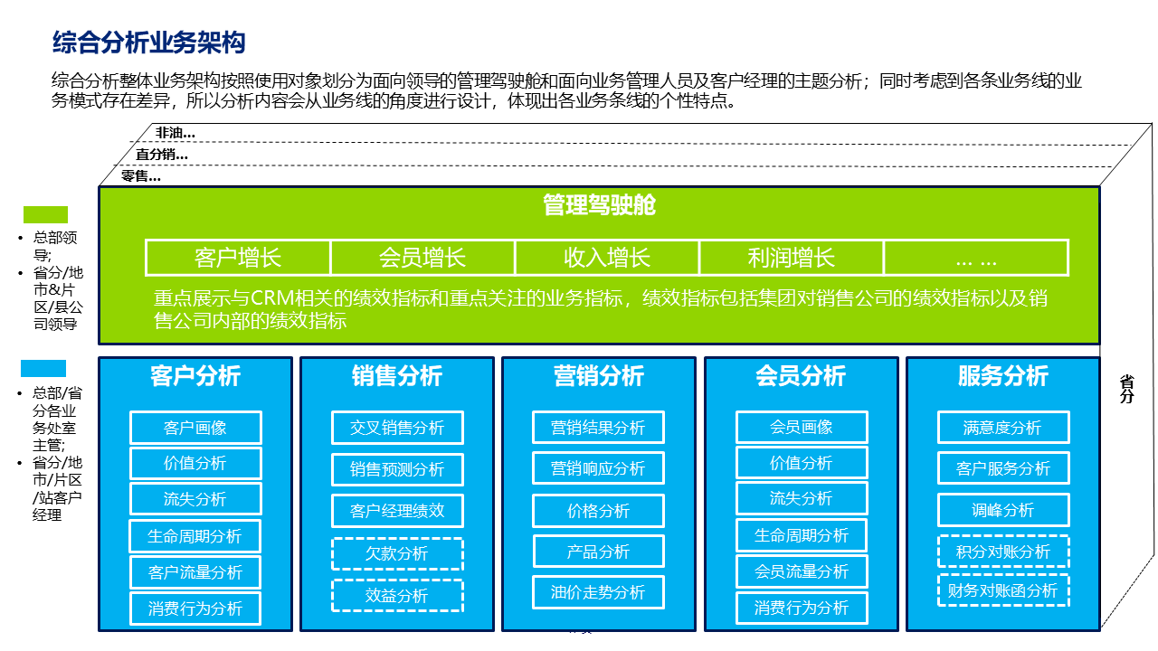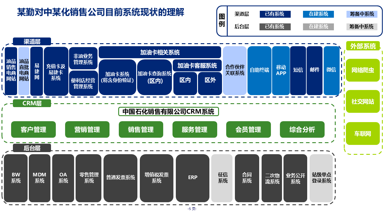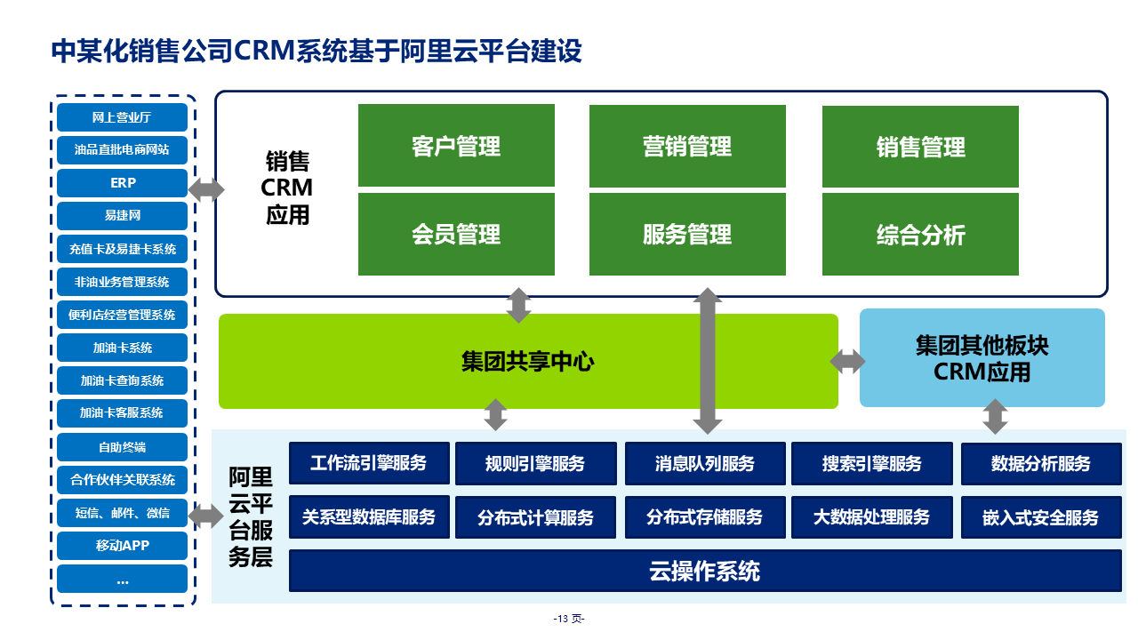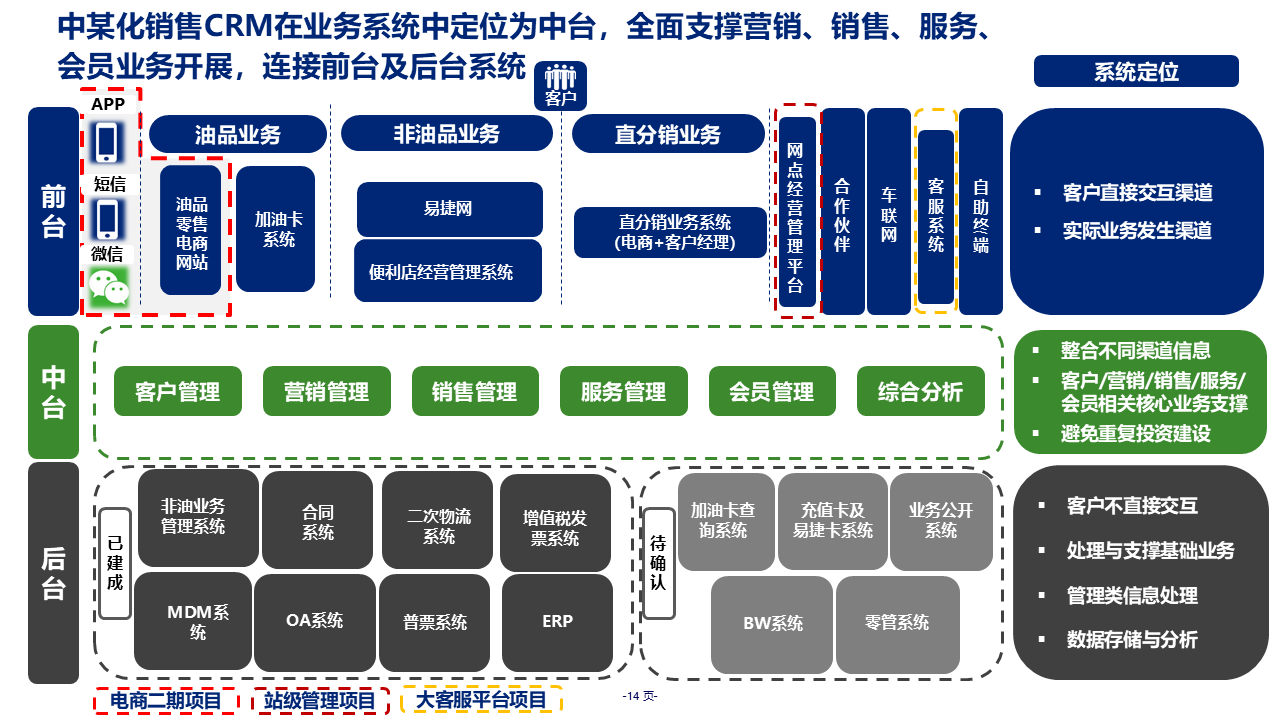 重要性总结:本规划是大型集团级 CRM 落地标杆方案,聚焦中石化销售业务痛点,以 "中台" 定位整合油品 / 非油品、直分销 / 零售全业务,覆盖客户、营销、销售、服务、会员五大核心模块。