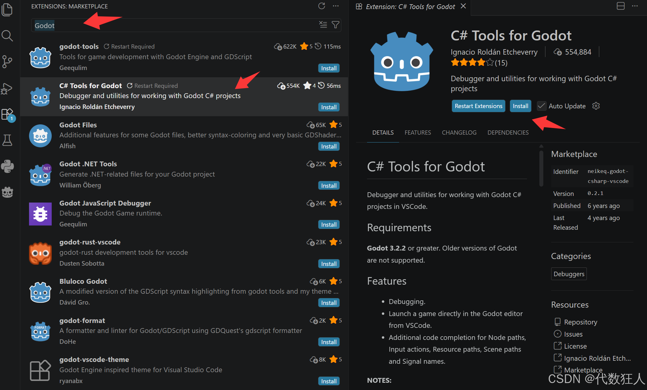在顶部的搜索框中输入 "Godot"。在搜索结果中找 "C# Tools for Godot" 扩展,点击"安装"按钮。