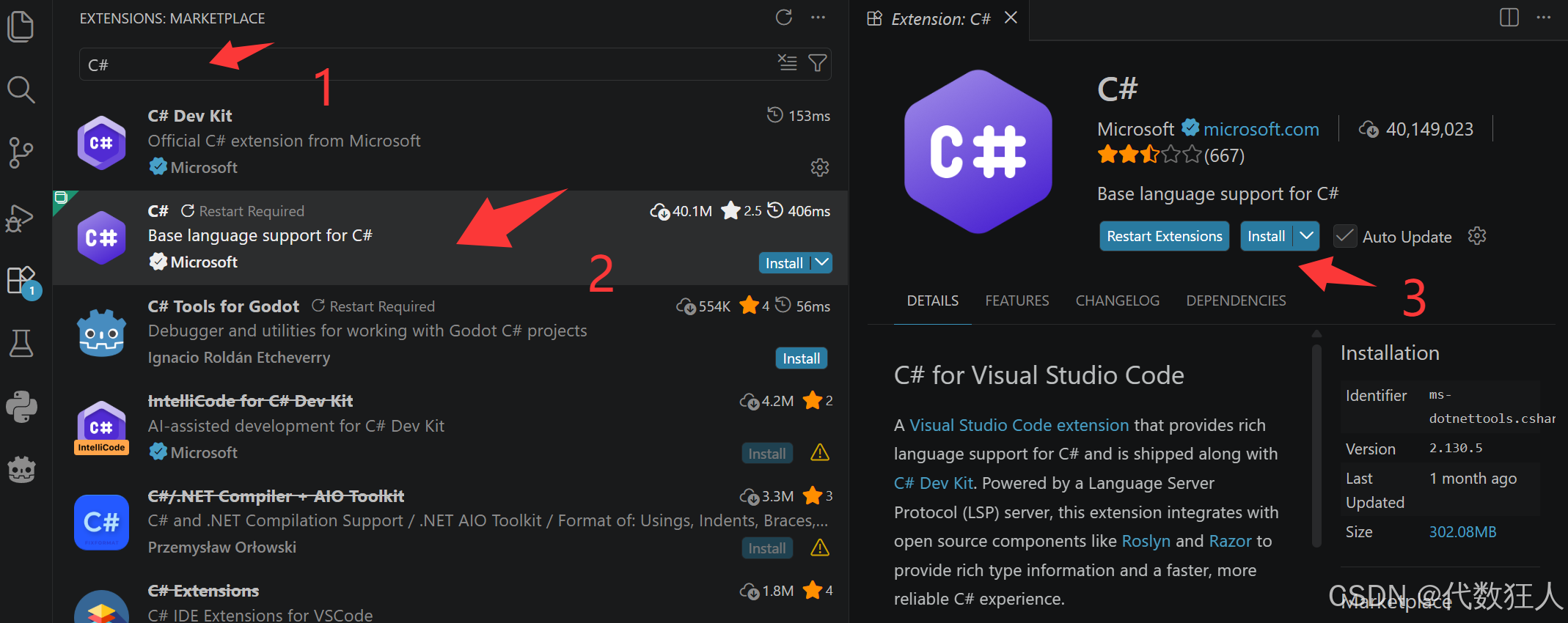 在搜索结果中找创建者是 Microsoft的 "C#" 扩展,点击"安装"按钮。