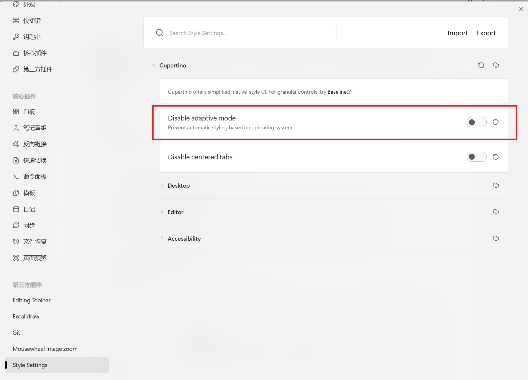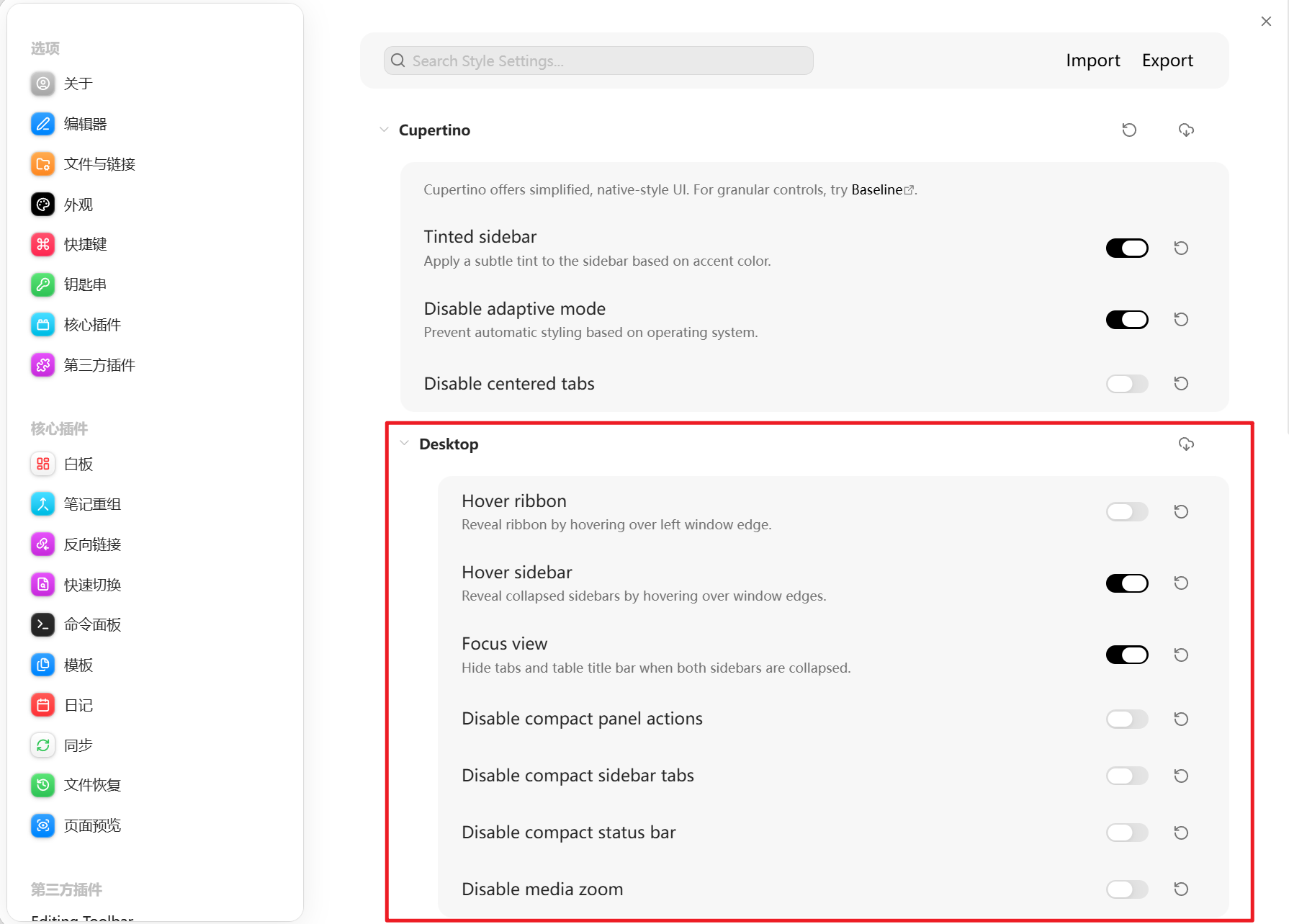 | Disable quick mode switcher (禁用快速模式切换器) | (隐藏编辑/阅读模式的快速切换按钮) | Cupertino 可能在编辑器右上角提供了一个美观的模式切换按钮。开启此开关后,将隐藏该按钮,使用 Obsidian 原生的切换方式。 |
