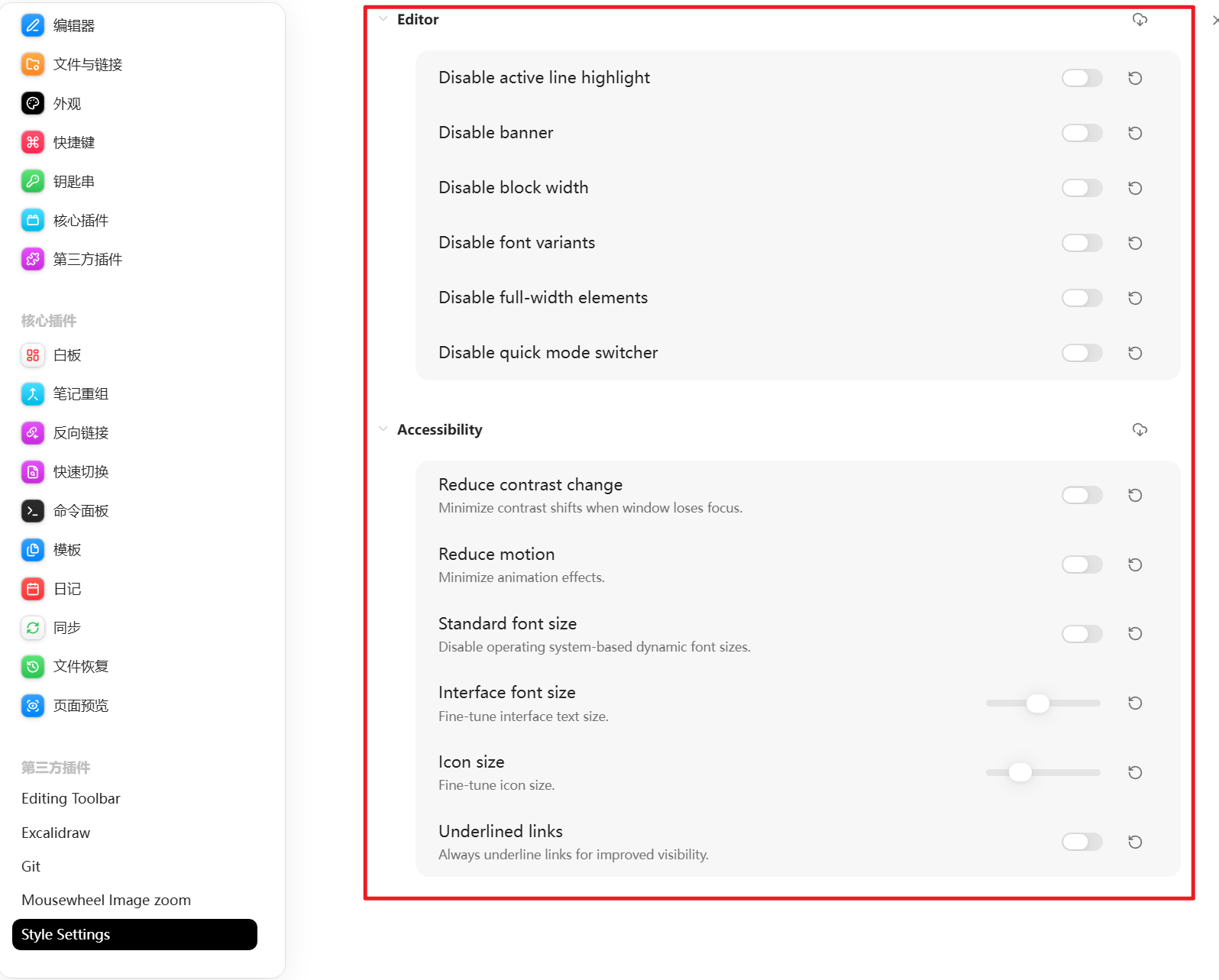 | Standard font size (标准字体大小) | Disable operating system-based dynamic font sizes. (禁用基于操作系统的动态字体大小) | 开启此开关后,将忽略系统设置(如 Windows 的缩放比例),强制使用 Obsidian 内部设定的字体大小,确保跨设备显示一致。 |