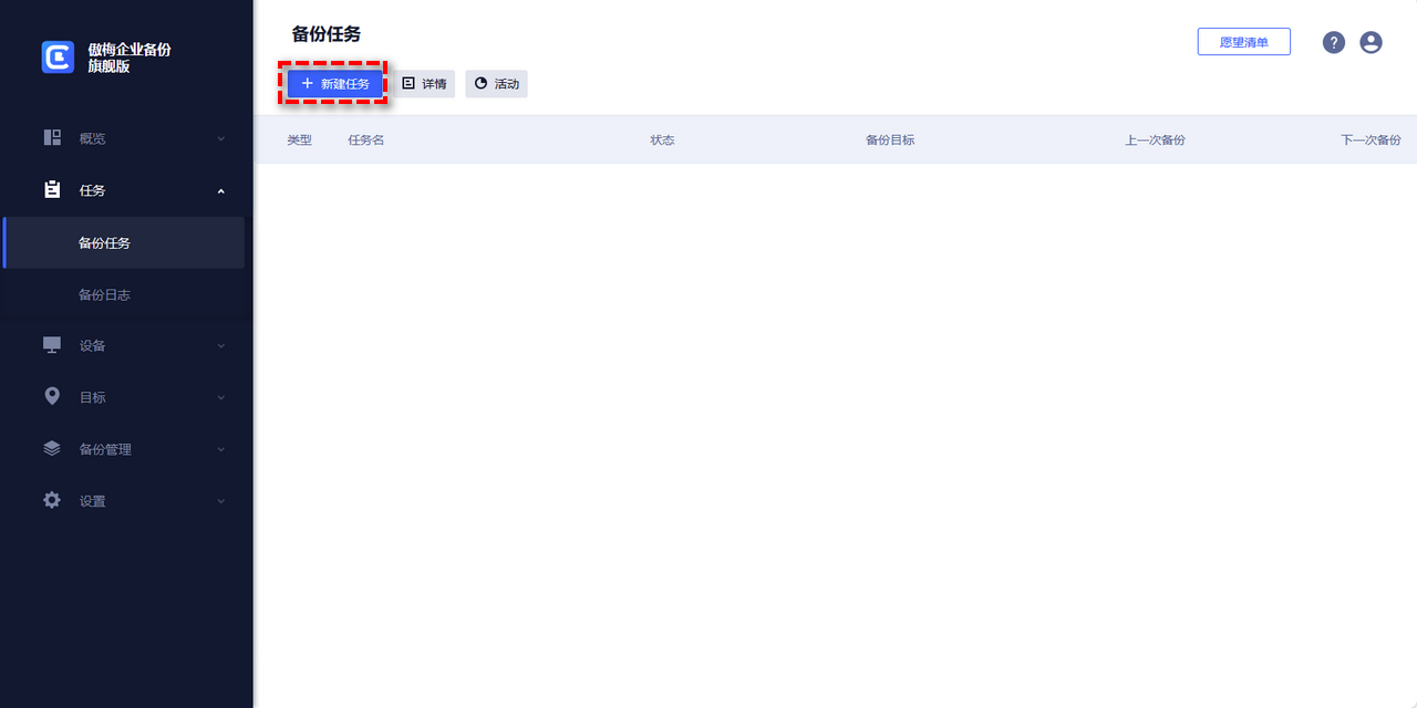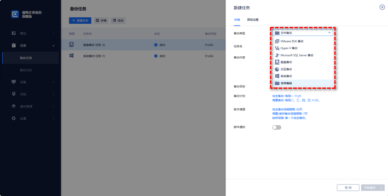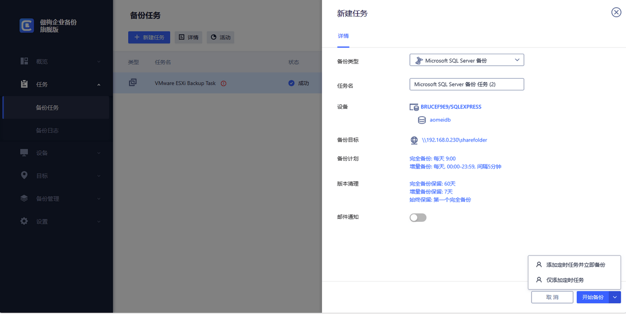 3. 确认无误后,点击 "开始备份" 按钮。如果设置了备份计划,可选择 "添加定时任务并立即备份" 或 "仅添加定时任务",任务将被监控,并可随时修改。