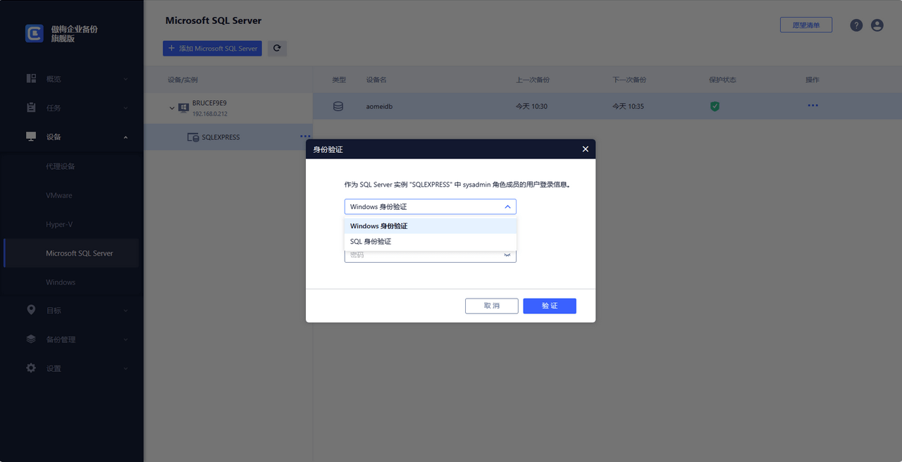 安装并连接代理客户端后,还需验证数据库实例。点击 "设备">"Microsoft SQL Server" ,找到数据库,点击右侧 "..." ,选择 "身份验证" ,选择 "SQL身份验证" ,输入账户密码,点击 "验证"。