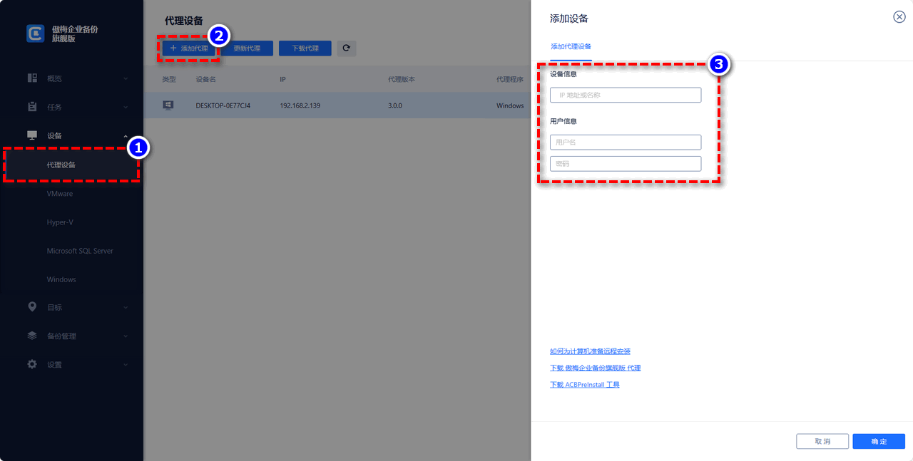 提示: 还可通过远程安装代理方式,点击 "设备">"代理设备">"添加代理" ,输入客户端计算机的IP地址和用户信息,点击 "确定" 进行远程安装。