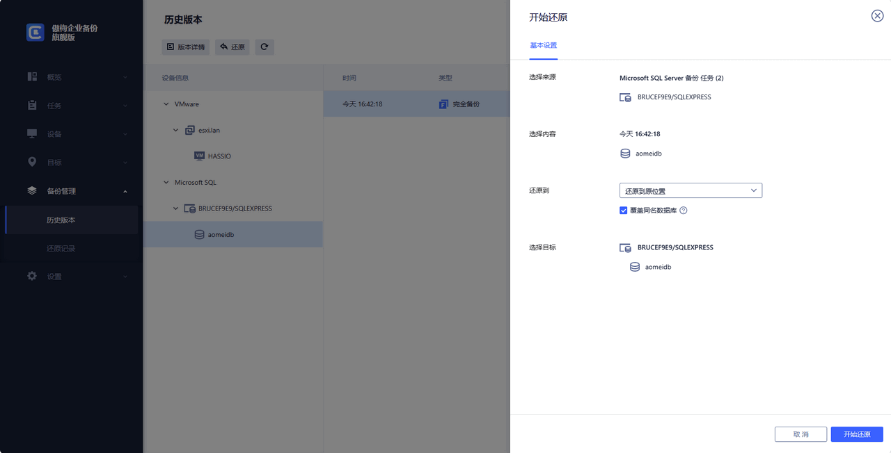 如需还原数据库,可前往 "备份管理">"历史版本" ,找到目标数据库备份版本,点击右侧 "..." ,选择 "还原",可选择还原到原位置或新位置。