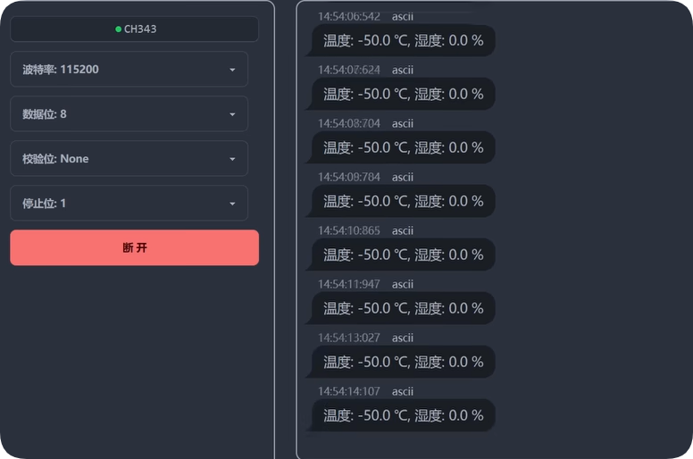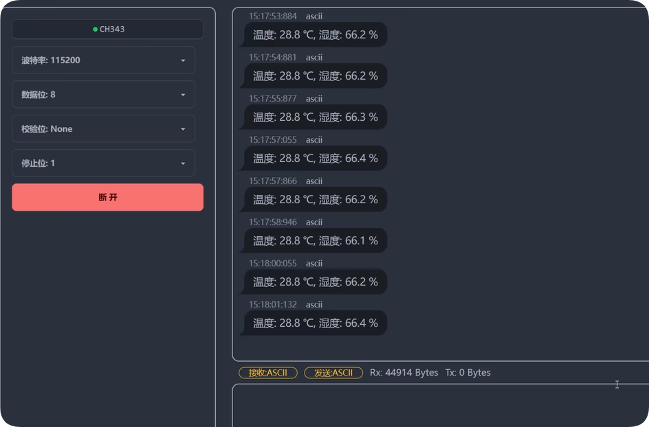 最后编译下载一气呵成。来到串口助手,又能准确地测量温湿度数据了