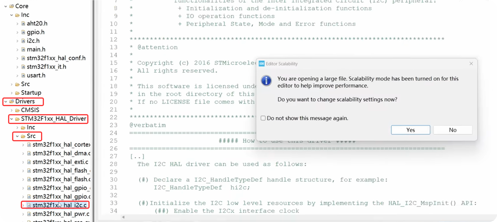 答案是有的,我们找到stm32f1xx_hal_i2c.c文件打开,出现这个提示,是因为此文件比较大,点击yes,
