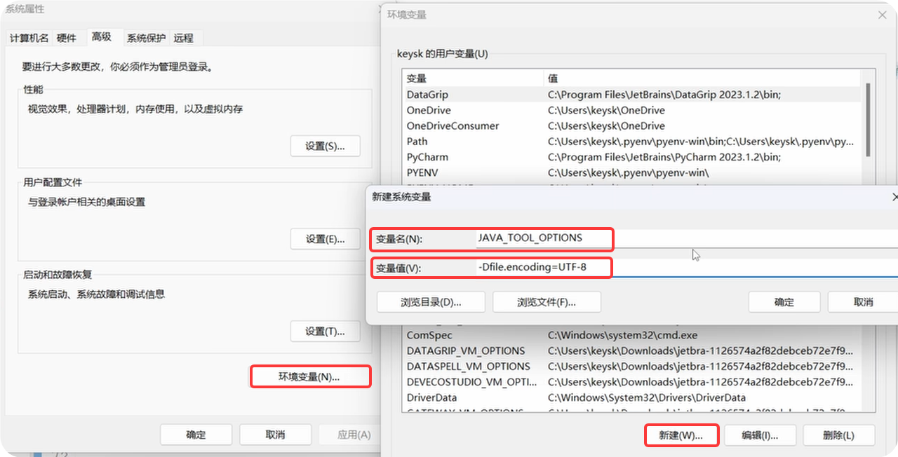对了,这里我们使用的是中文注释,在Cube IDE里使用中文有一点是一定要注意的,就是使用Cube IDE重新生成代码后,中文会乱码。这是由于编码不一致造成的。我们需要搜索打开Windows的环境变量,新建一个系统变量,变量名为JAVA_TOOL_OPTIONS,变量值设置为-Dfile.encoding=UTF-8,确定之后重新启动Cube IDE就不会出现这种情况了。